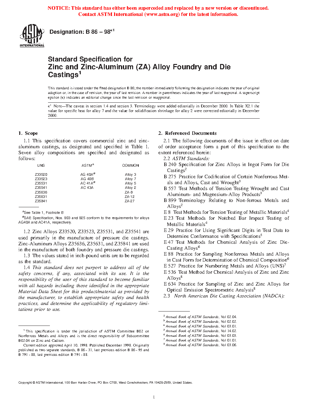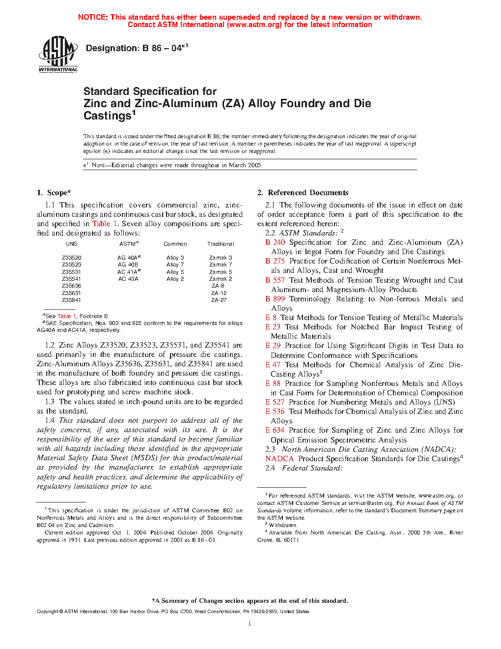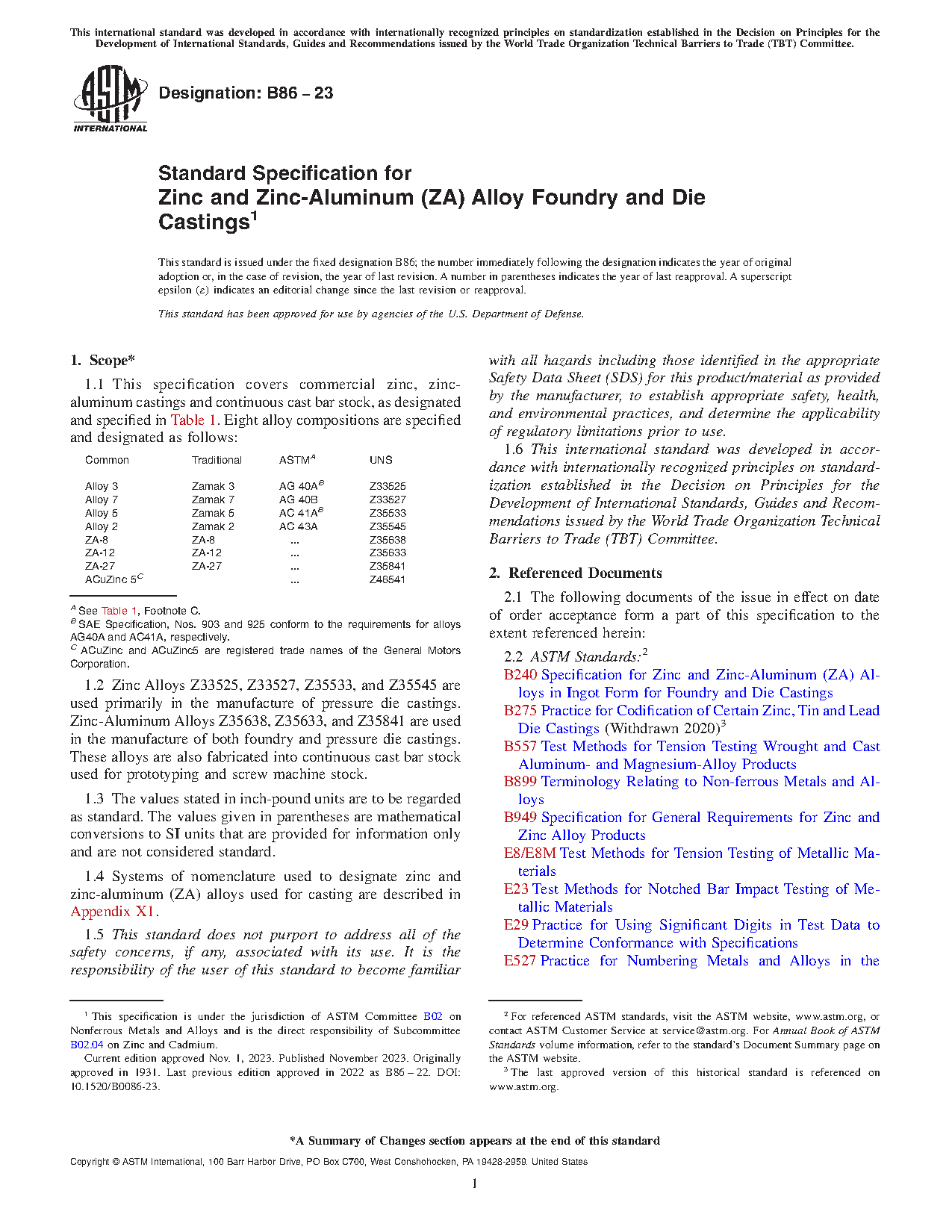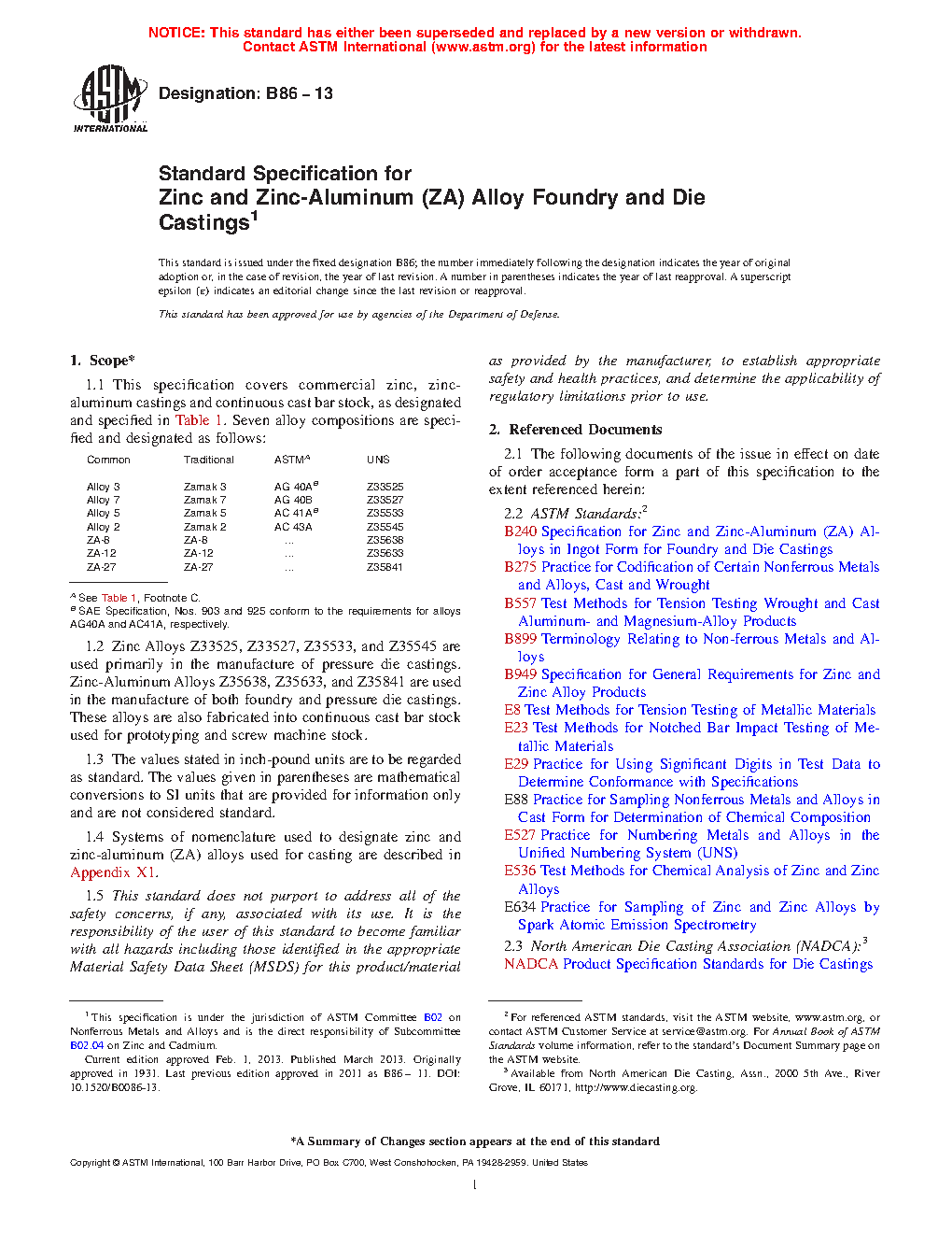 1.1 This specification covers commercial zinc, zinc-aluminum castings and continuous cast bar stock, as designated and specified in Table 1. Seven alloy compositions are specified and designated as follows: