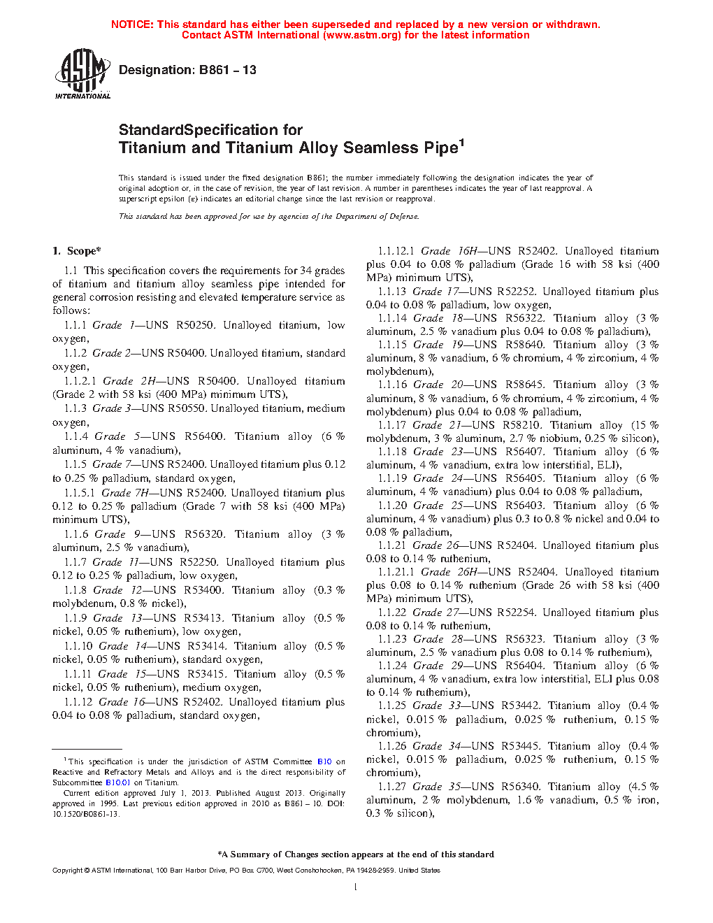 1.1 This specification covers the requirements for 26 grades of titanium and titanium alloy seamless pipe intended for general corrosion resisting and elevated temperature service as follows: