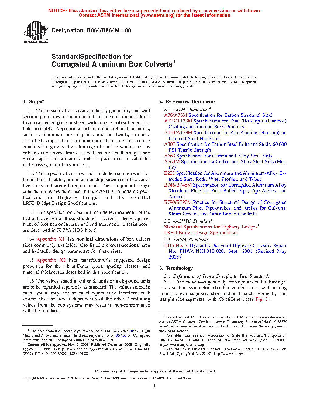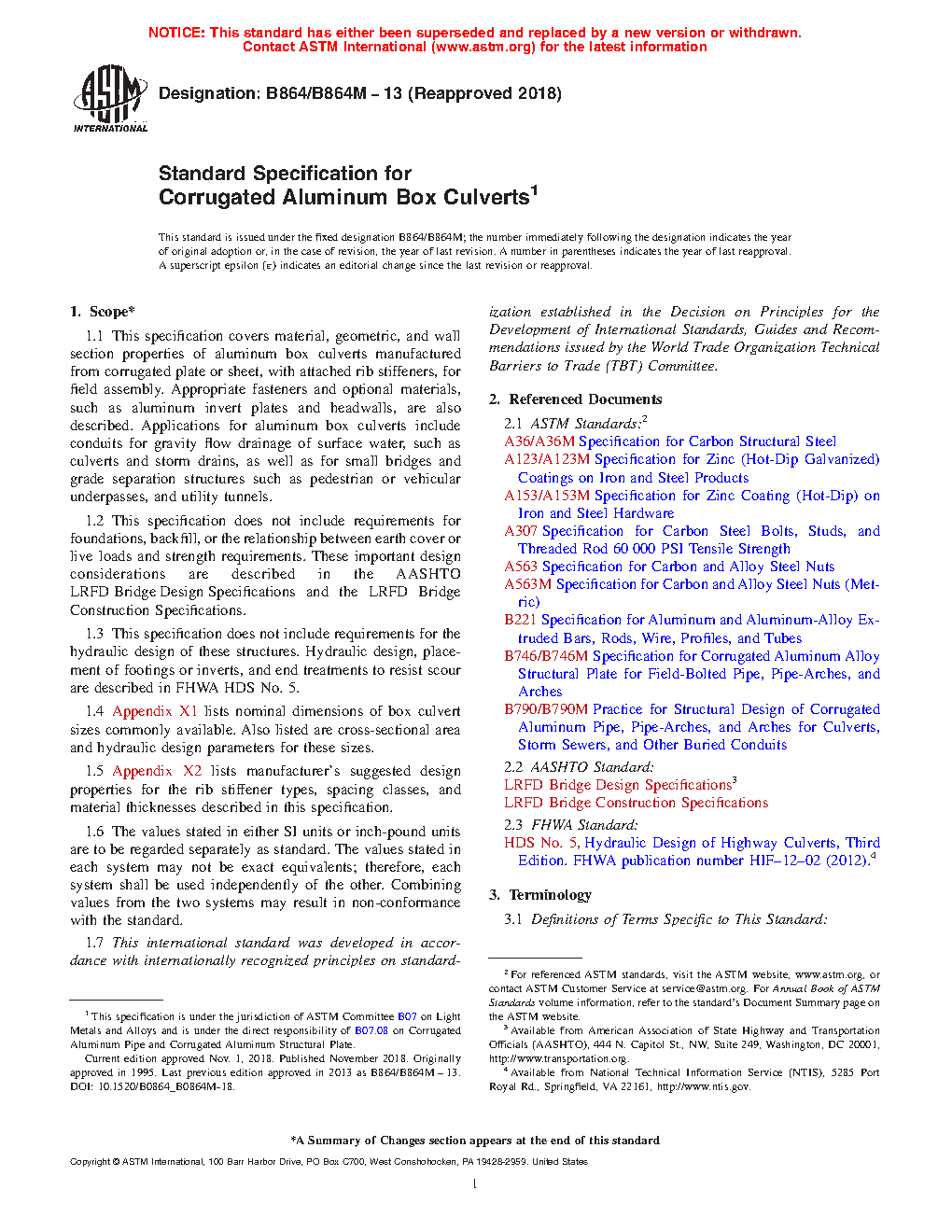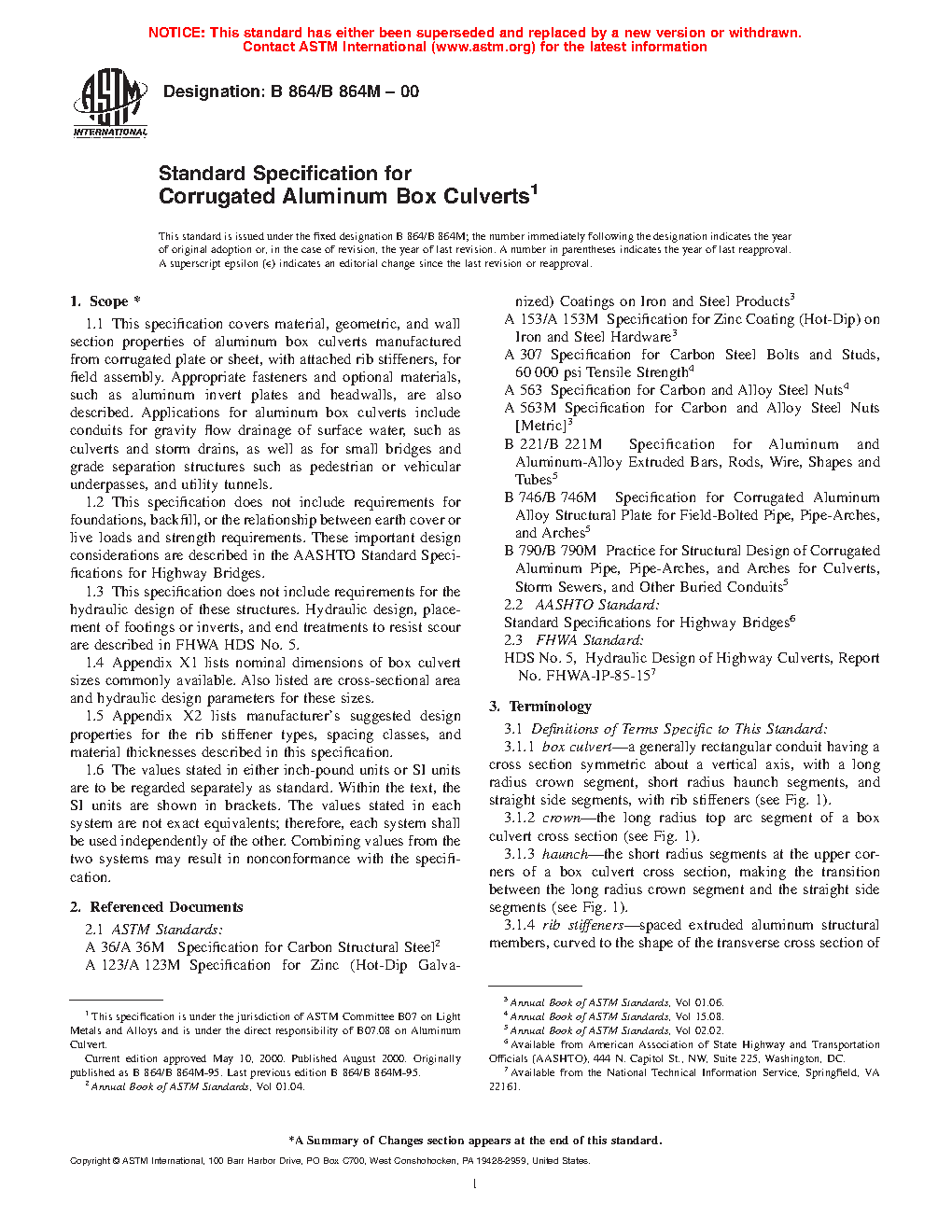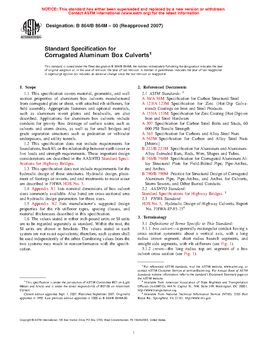 1.3 This specification does not include requirements for the hydraulic design of these structures. Hydraulic design, placement of footings or inverts, and end treatments to resist scour are described in FHWA HDS No. 5.