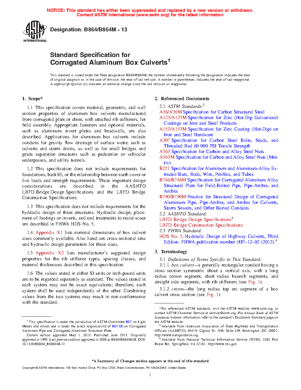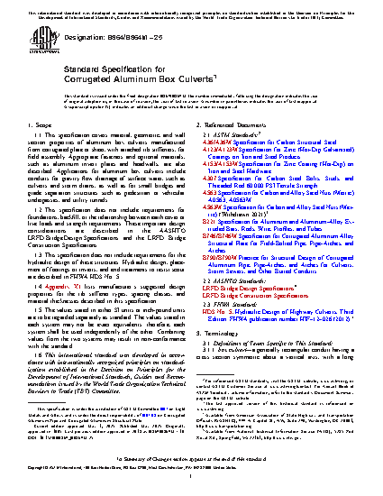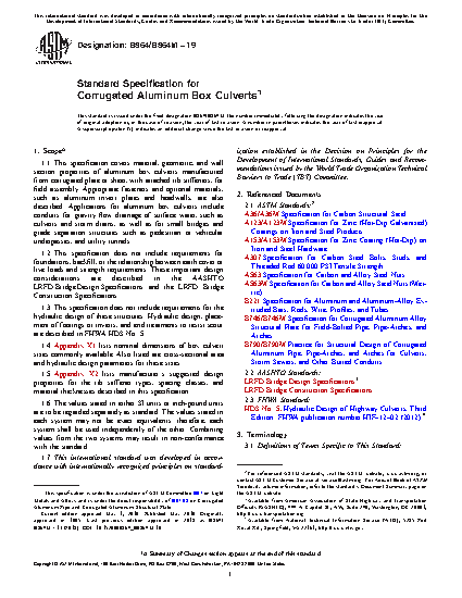 This specification covers the requirements for material, geometric, and wall section properties of aluminum box culverts manufactured from corrugated plate or sheet with attached rib stiffeners, for field assembly. Suitable fasteners and optional materials such as aluminum invert plates and headwalls are also described here. Material applications include surface water gravity flow drainage conduits like culverts and storm drains, small bridge, and grade separation structure conduits like pedestrian or vehicular underpasses, and utility tunnels. This specification does not cover the requirements for foundations, backfill, the relationship between earth cover or live loads and strength requirements, or the hydraulic design of these structures. The required plastic moment capacities should be determined for both the crown and haunch segments of the box culverts.