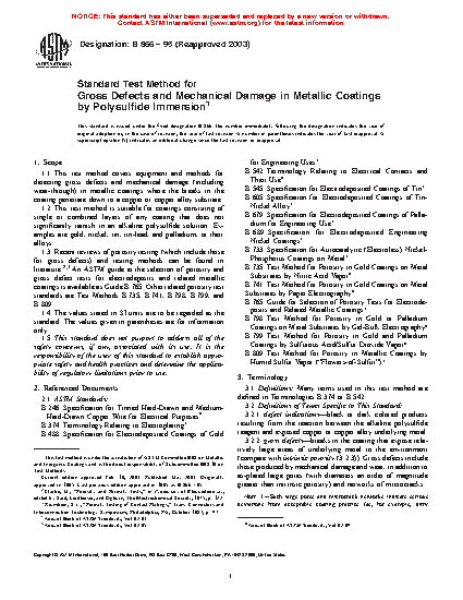 5.3 The alkaline polysulfide test has been specified in several ASTM specifications for tin-plated coatings, namely Specifications B246 and B545. This test could also be used to detect gross defects and mechanical damage in other metallic coatings, such as tin-nickel alloy (Specification B605), nickel (Specification B689), gold (Specification B488), palladium (Specification B679), and autocatalytic nickel-phosphorous coatings (Specification B733).