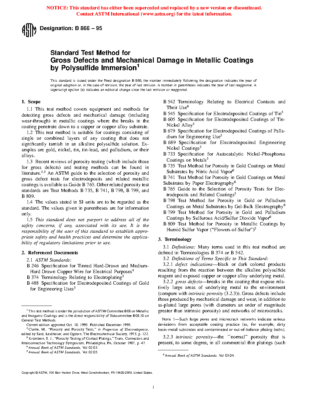 1.3 Recent reviews of porosity testing (which include those for gross defects) and testing methods can be found in literature.2,3 An ASTM guide to the selection of porosity and gross defect tests for electrodeposits and related metallic coatings is available as Guide B765. Other related porosity test standards are Test Methods B735, B741, B798, B799, and B809.
