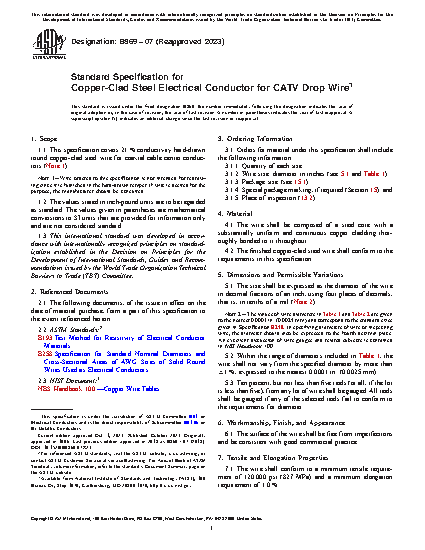 1.1 This specification covers 21 % conductivity hard-drawn round copper-clad steel wire for coaxial cable center conductors (Note 1).