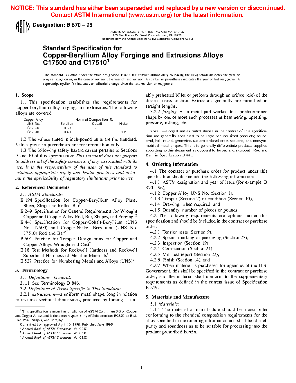 1.1 This specification establishes the requirements for copper-beryllium alloy forgings and extrusions. The following alloys are specified: