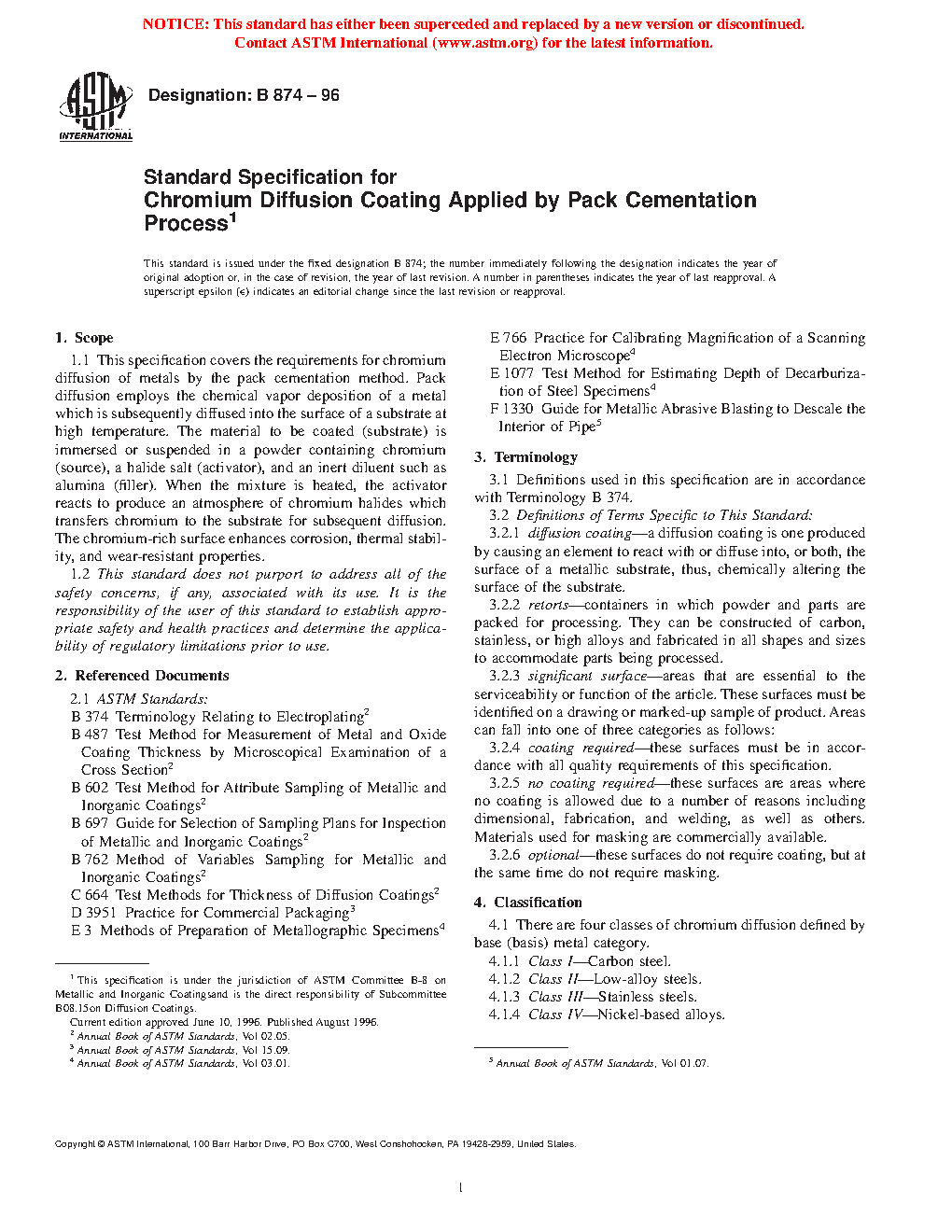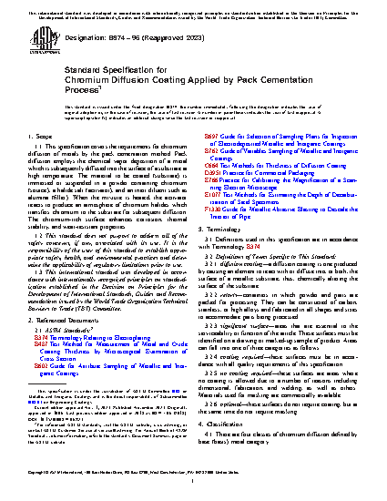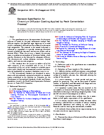 This specification covers the requirements for chromium diffusion of metals applied by pack cementation process. The four classes of chromium diffusion coating, defined by the type of base metal, are as follows: Class I (carbon steels); Class II (low-alloy steels); Class III (stainless steels); and Class IV (nickel-based alloys). Specimens shall adhere to processing requirements such as substrate preparation, materials (masteralloys, activators, and inert fillers), loading, furnace cycle, post cleaning, post straightening, visual inspection, and marking and packaging. Specimens shall also adhere to coating requirements such as diffusion thickness, decarburization, chromium content, appearance, and mechanical properties (tensile strength, and macro- and micro-hardness).