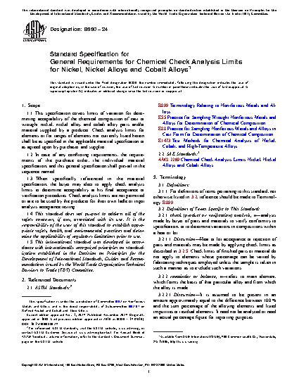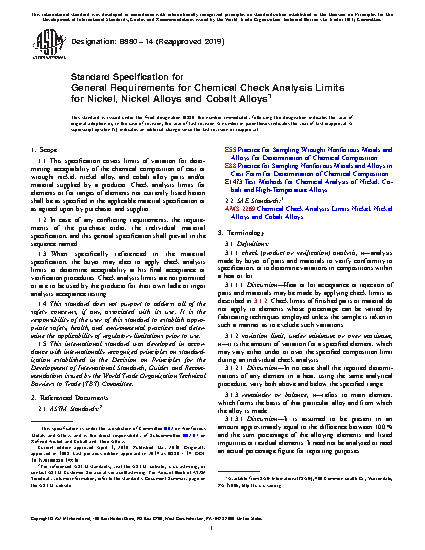 This specification details the limits of variation for determining the chemical check analysis limits of cast or wrought nickel, nickel alloy and cobalt alloy parts and/or supplied material.