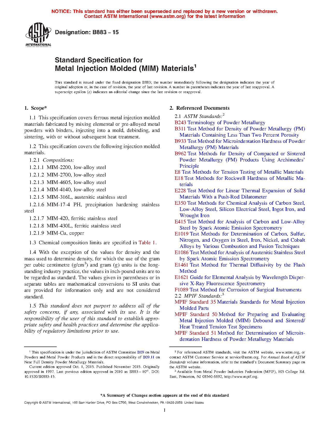 1.1 This specification covers ferrous metal injection molded materials fabricated by mixing elemental or pre-alloyed metal powders with binders, injecting into a mold, debinding, and sintering, with or without subsequent heat treatment.