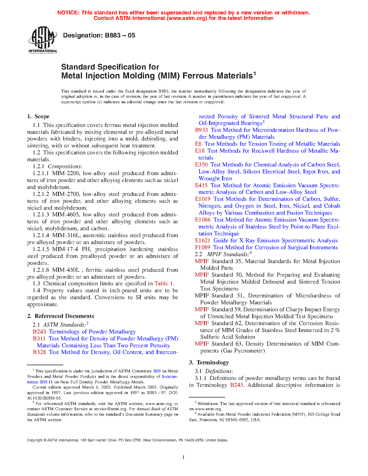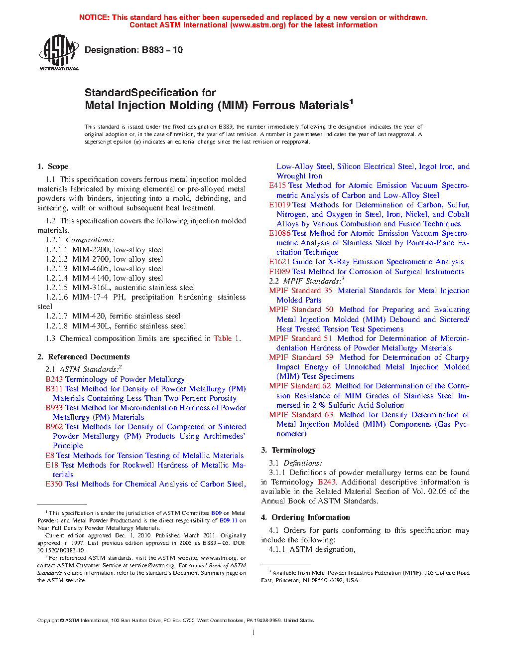 This specification covers ferrous metal injection molded (MIM) materials fabricated by mixing elemental or pre-alloyed metal powders with binders, injecting into a mold, debinding, and sintering with or without subsequent heat treatment. These materials are: low-alloy steel produced from admixtures of iron powder and other alloying elements such as nickel and molybdenum (MIM-2200 and MIM-2700); low-alloy steel produced from admixtures of iron powder and other alloying elements such as nickel, molybdenum, and carbon (MIM-4605); austenitic stainless steel produced from pre-alloyed powder or an admixture of powders (MIM-316L); precipitation hardening stainless steel produced from pre-alloyed powder or an admixture of powders (MIM-17-4 PH); and ferritic stainless steel produced from pre-alloyed powder or an admixture of powders (MIM-430L). Chemical analysis shall be performed for the elements copper, chromium, molybdenum, and nickel. The materials shall be subjected to tensile test and unnotched Charpy impact energy test.