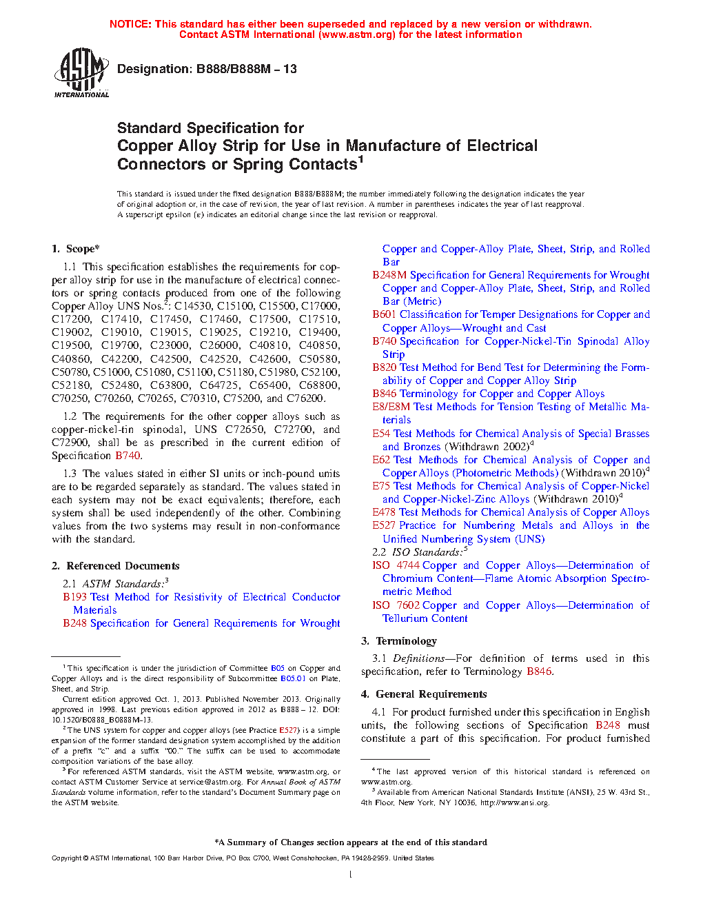 1.2 The requirements for the other copper alloys such as copper-nickel-tin spinodal, UNS C72650, C72700, and C72900, shall be as prescribed in the current edition of Specification B740.