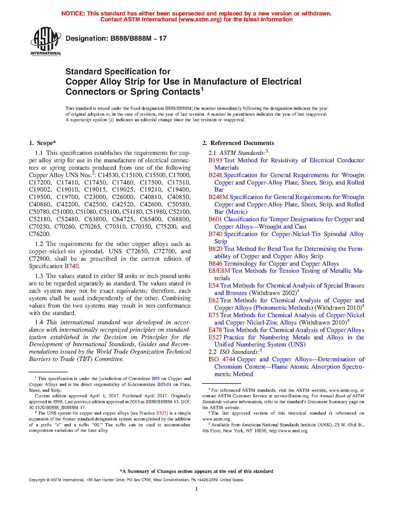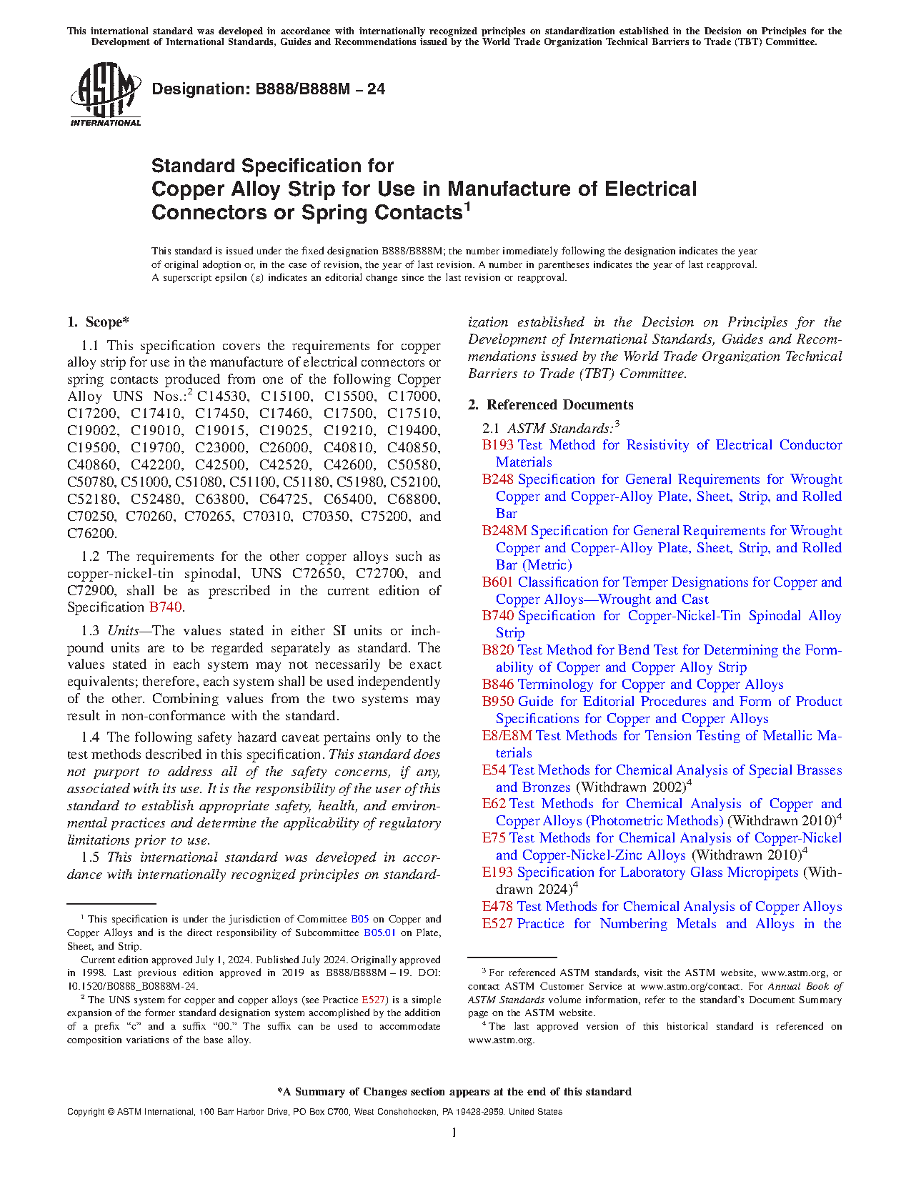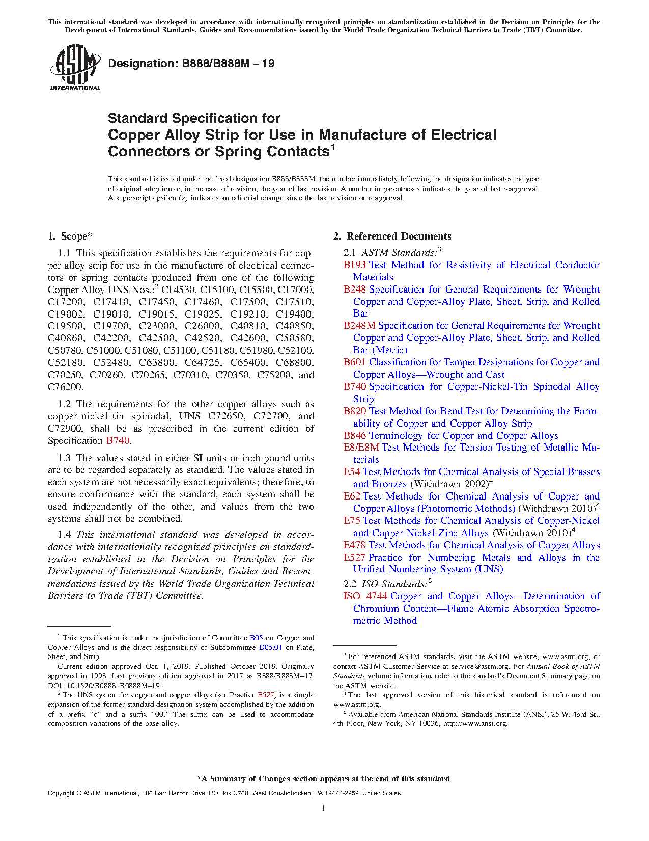 1.1 This specification covers the requirements for copper alloy strip for use in the manufacture of electrical connectors or spring contacts produced from one of the following Copper Alloy UNS Nos.:2 C14530, C15100, C15500, C17200, C17410, C17460, C17510, C19002, C19010, C19015, C19025, C19210, C19400, C19700, C23000, C26000, C42200, C42500, C51000, C51100, C52100, C64725, C65400, C68800, C70250, C70260, C70265, C70310, C70350, C75200, and C76200.