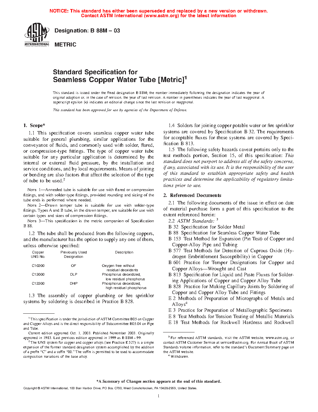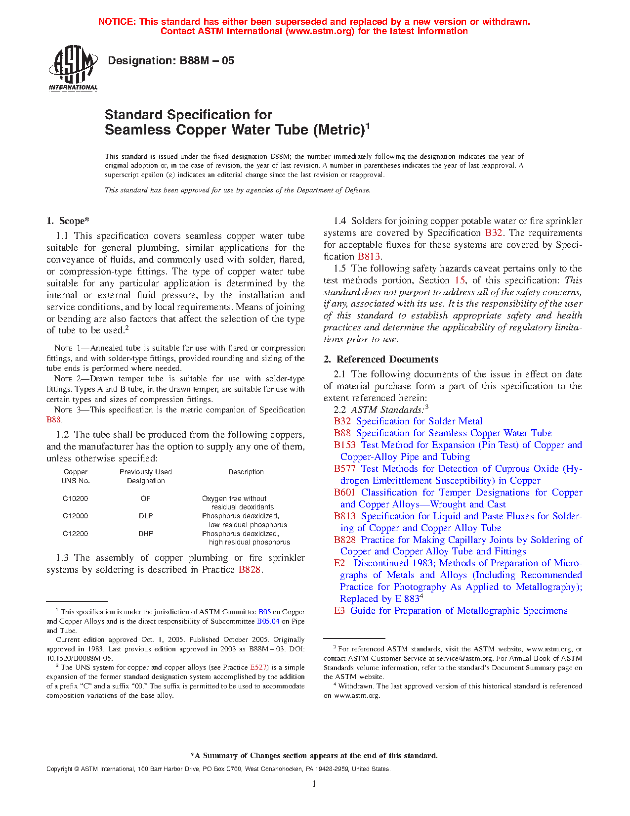This specification covers seamless copper alloy water tubes for general plumbing and similar applications in fluid conveyance. These water tubes made from UNS C10200, C12000, and C12200 copper alloys are commonly used with solder, flared, or compression-type fittings. The materials should be cold-drawn to size and the tubes finished by cold working and annealing to produce the required temper and surface finish. When tubes are furnished in coils, annealing is done after coiling, while those furnished in straight lengths should be in the drawn temper. The numerical values in this specification are not presented in inch-pound units, but rather, in metric or SI units only.