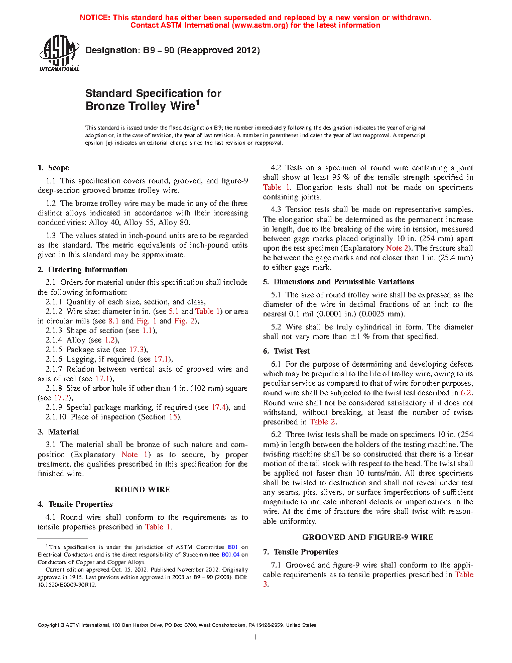 1.1 This specification covers round, grooved, and figure-9 deep-section grooved bronze trolley wire.