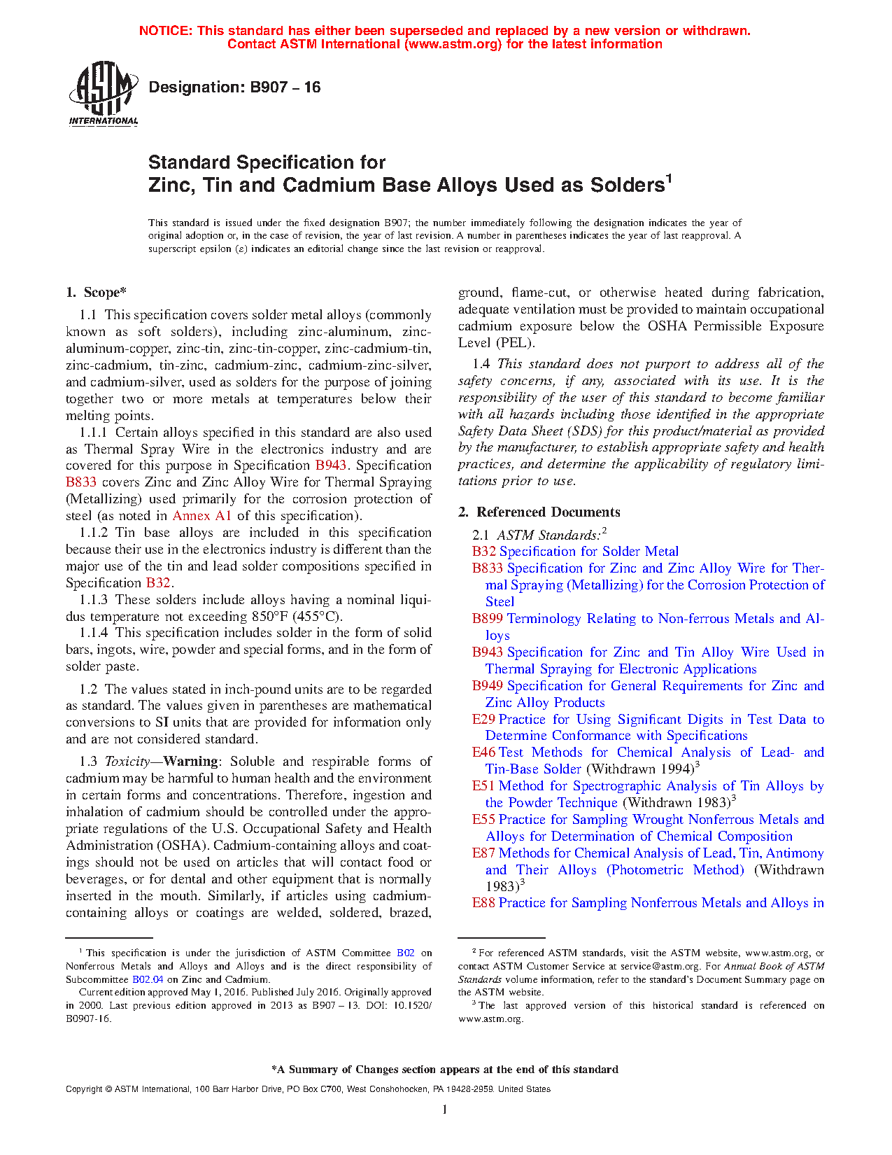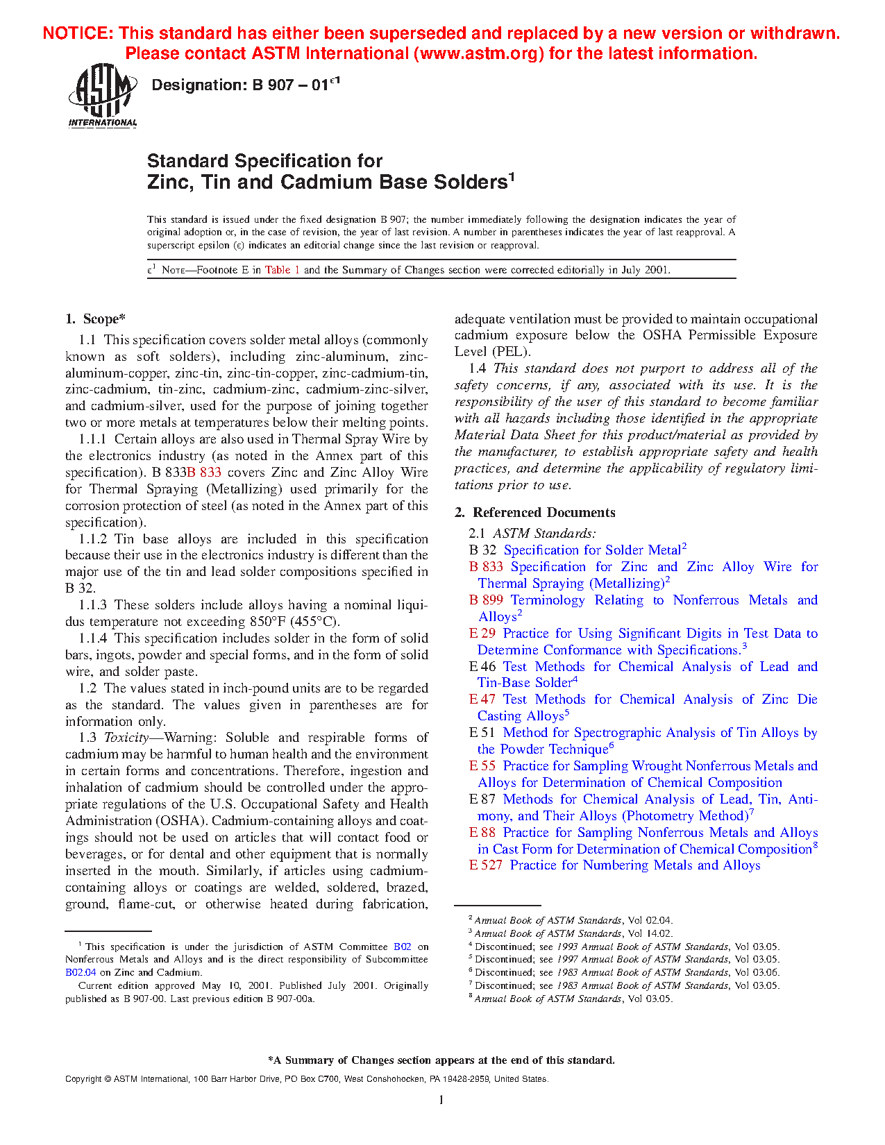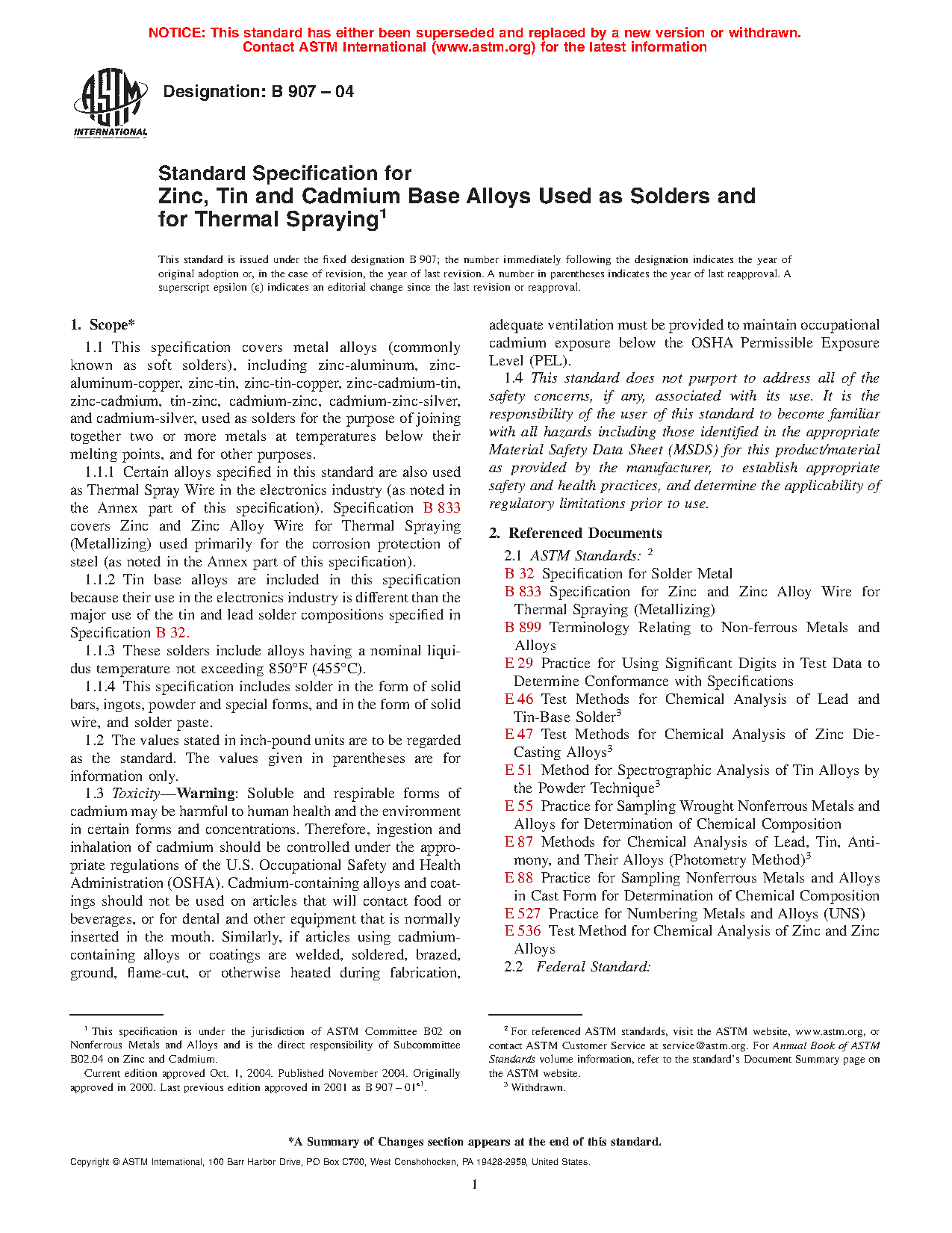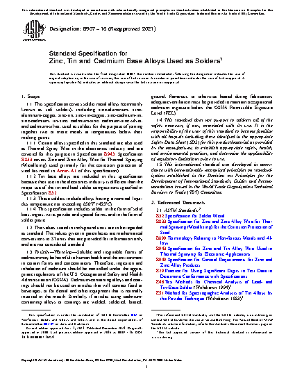 1.1 This specification covers solder metal alloys (commonly known as soft solders), including zinc-aluminum, zinc-aluminum-copper, zinc-tin, zinc-tin-copper, zinc-cadmium-tin, zinc-cadmium, tin-zinc, cadmium-zinc, cadmium-zinc-silver, and cadmium-silver, used as solders for the purpose of joining together two or more metals at temperatures below their melting points.