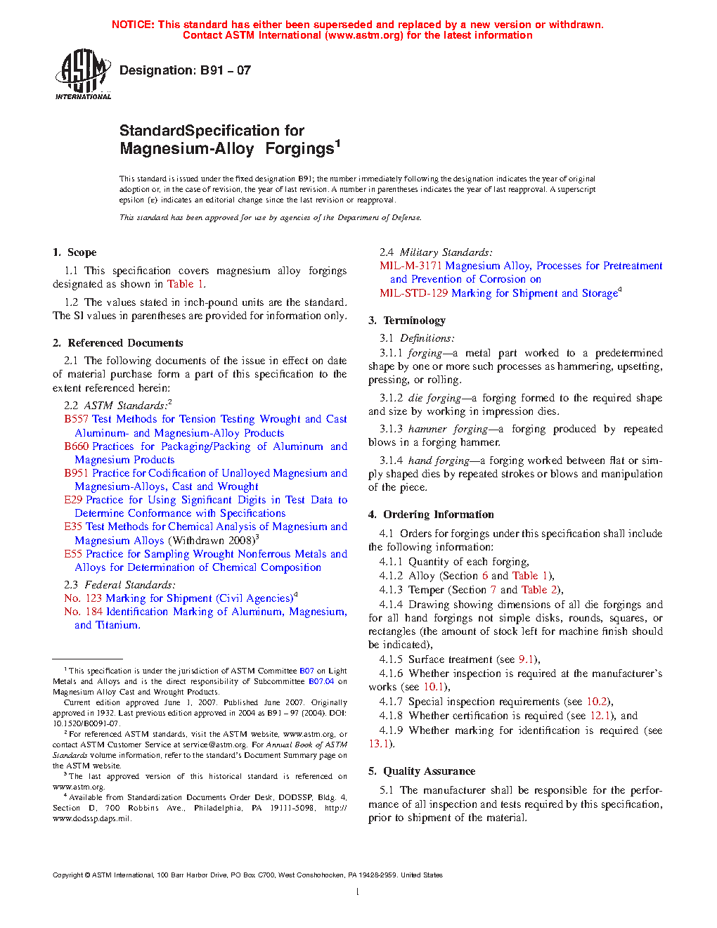 1.1 This specification covers magnesium alloy forgings designated as shown in Table 1.