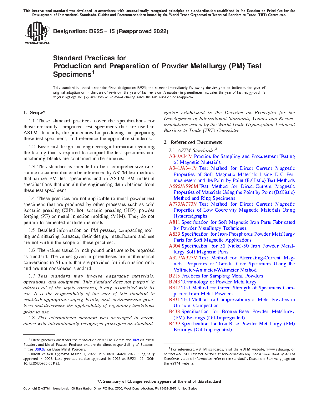 1.3 This standard is intended to be a comprehensive one-source document that can be referenced by ASTM test methods that utilize PM test specimens and in ASTM PM material specifications that contain the engineering data obtained from these test specimens.