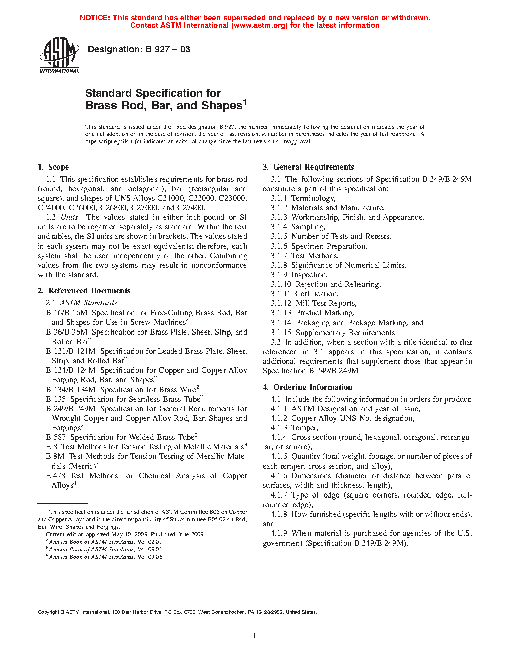 1.1 This specification establishes requirements for brass rod (round, hexagonal, and octagonal), bar (rectangular and square), and shapes of UNS Alloys C21000, C22000, C23000, C24000, C26000, C26800, C27000, and C27400.