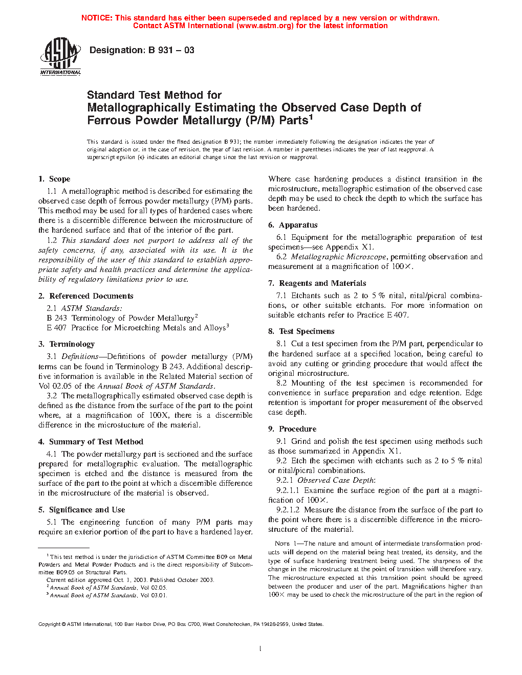 1.1 A metallographic method is described for estimating the observed case depth of ferrous powder metallurgy (PM) parts. This method may be used for all types of hardened cases where there is a discernible difference between the microstructure of the hardened surface and that of the interior of the part.