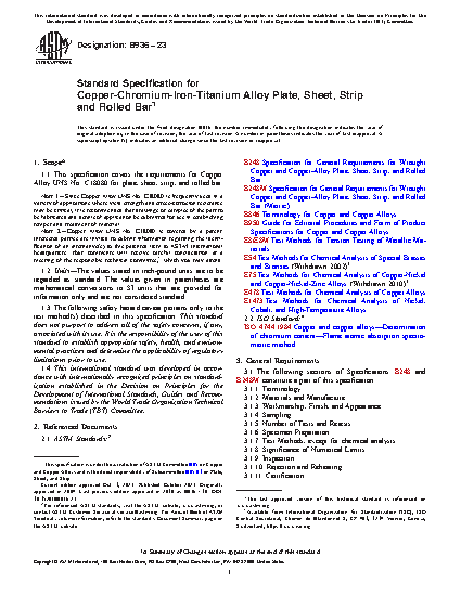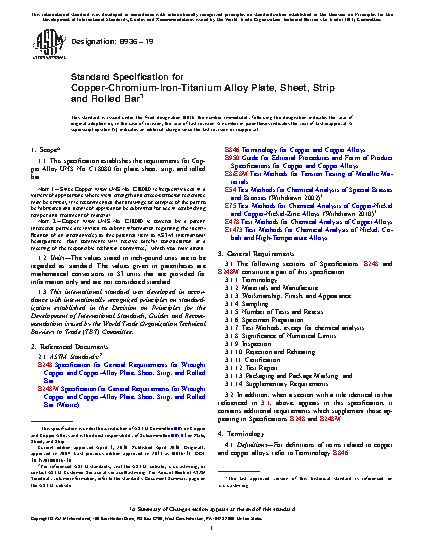 This specification establishes the requirements for plates, sheets, strips, and rolled bars of copper-chromium-iron-titanium alloys with Copper Alloy UNS No. C18080. The material for manufacture shall be a cast bar, cake, slab or so forth of such purity and soundness as to be suitable for processing by hot working, cold working, and subsequent annealing to produce finished products that have a uniform wrought structure and meet the specified temper properties. Products shall be available in the mill hardened temper (TM). Products shall be sampled and prepared, then tested accordingly to examine their conformance to dimensional (mass, thickness, width, length, straightness, and edge), mechanical (tensile strength and Rockwell hardness), electrical (resistivity and equivalent conductivity), and chemical composition requirements.
