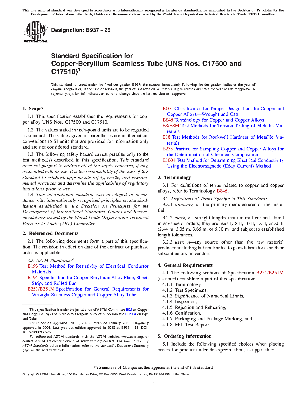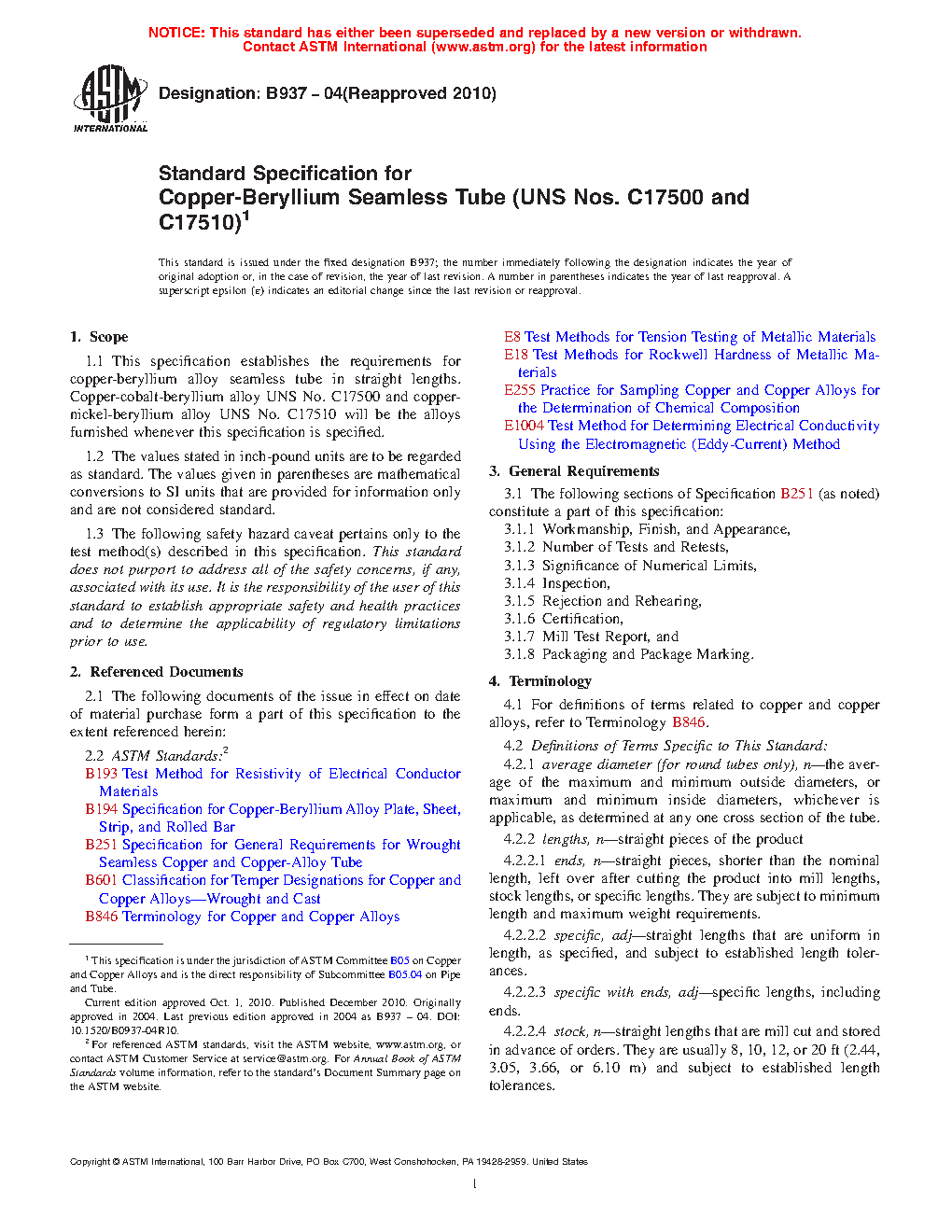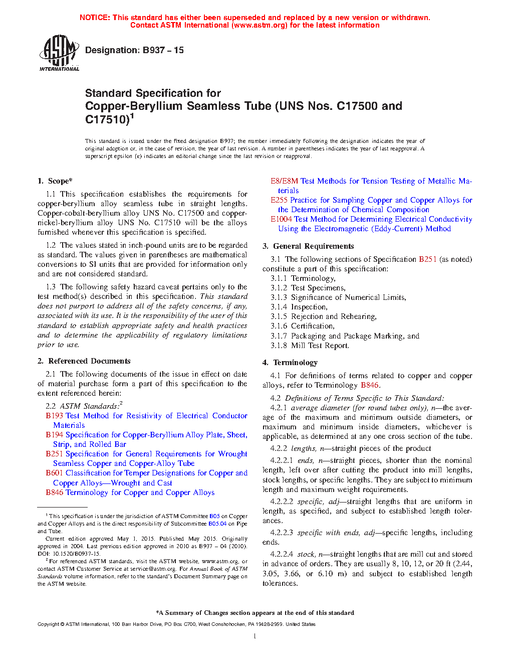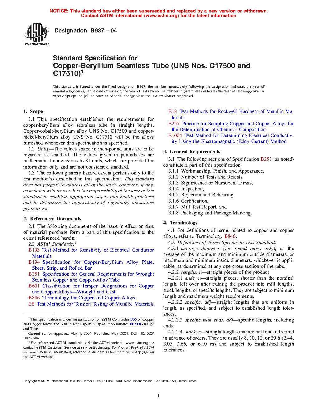 1.1 This specification establishes the requirements for copper-beryllium alloy seamless tube in straight lengths. Copper-cobalt-beryllium alloy UNS No. C17500 and copper-nickel-beryllium alloy UNS No. C17510 will be the alloys furnished whenever this specification is specified.