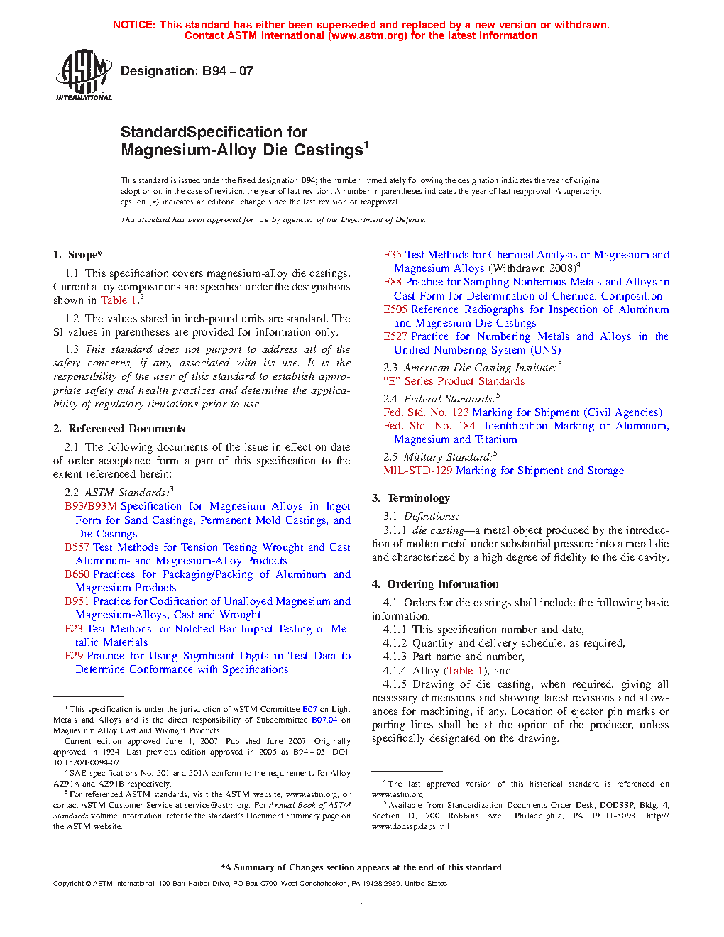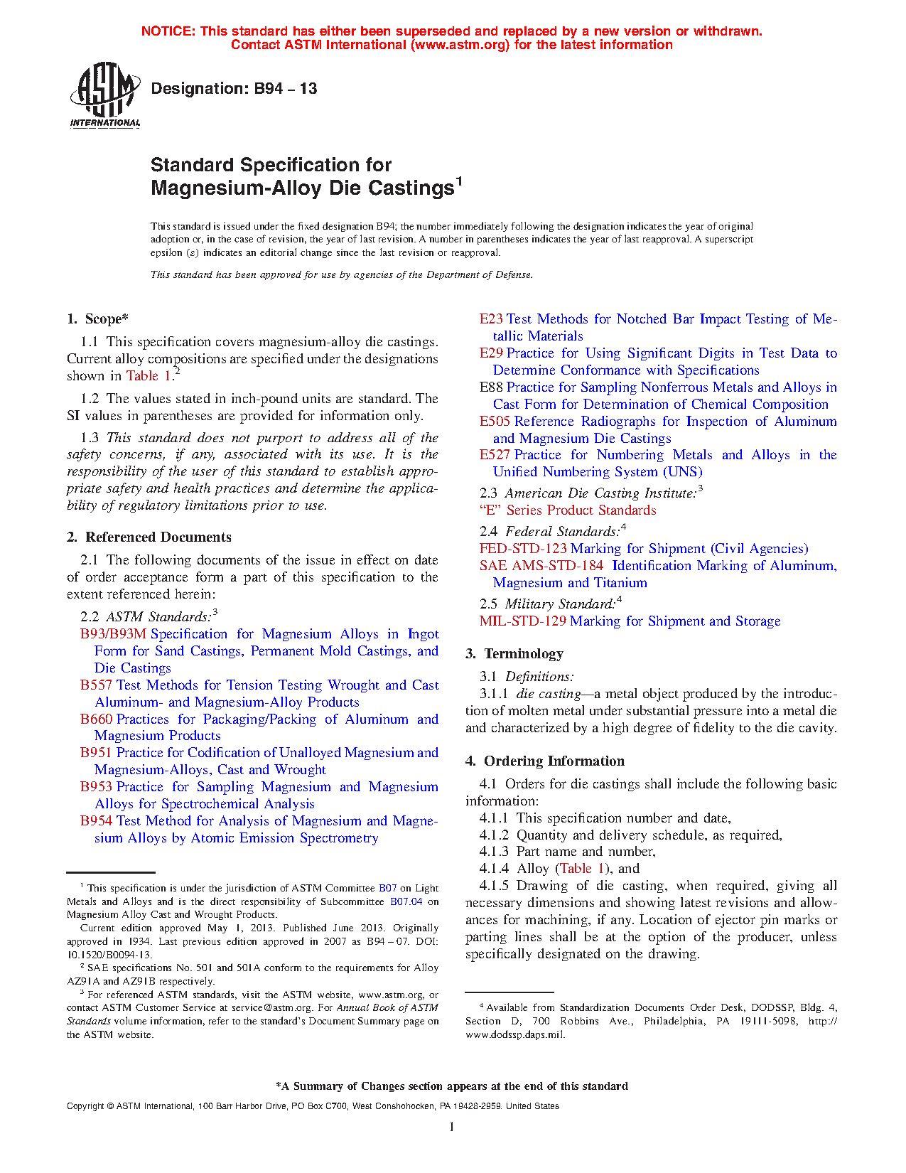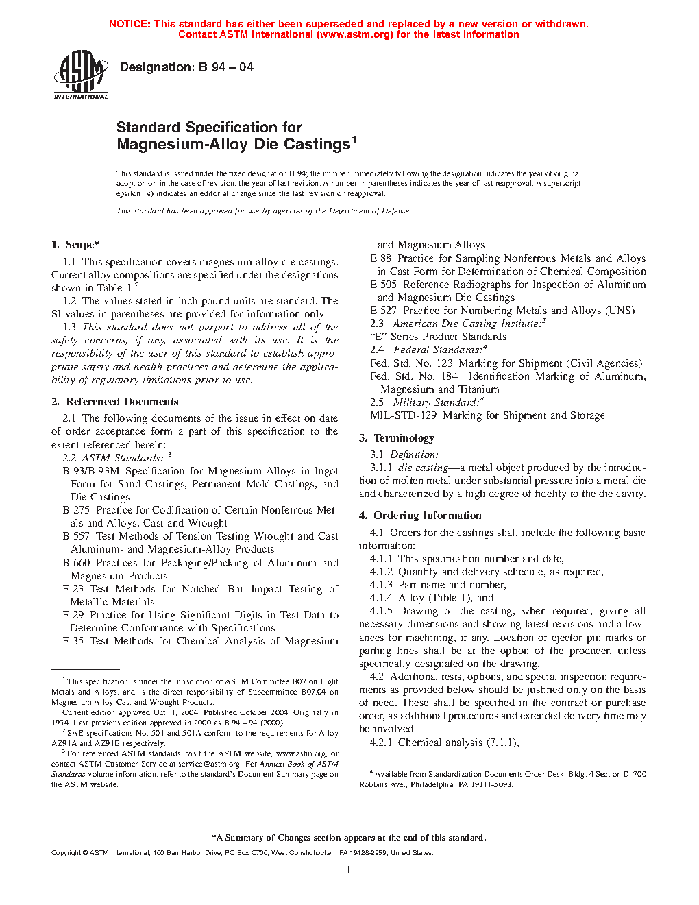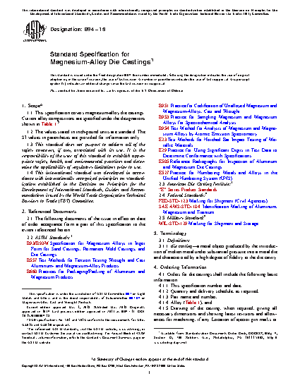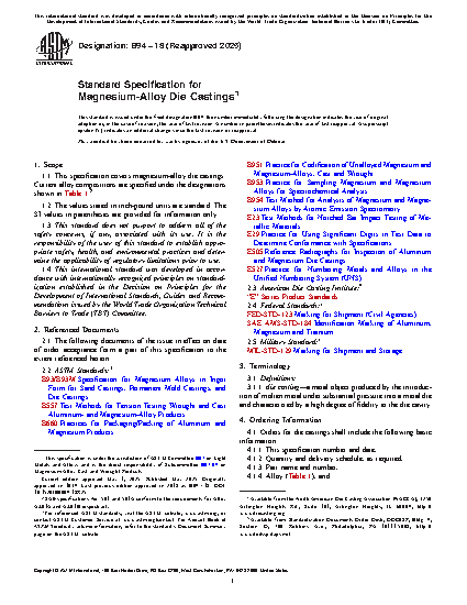 1.1 This specification covers magnesium-alloy die castings. Current alloy compositions are specified under the designations shown in Table 1.2