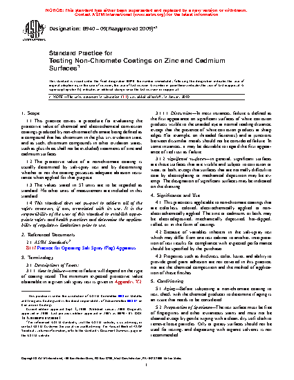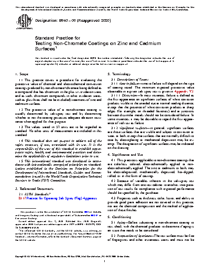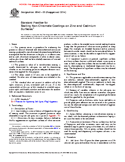 1.1 This practice covers a procedure for evaluating the protective value of chemical and electrochemical conversion coatings produced by non-chromate (chromate being defined as a compound that has chromium in the plus six oxidation state, and as such, chromium compounds in other oxidation states, such as plus three, shall not be excluded) treatments of zinc and cadmium surfaces.