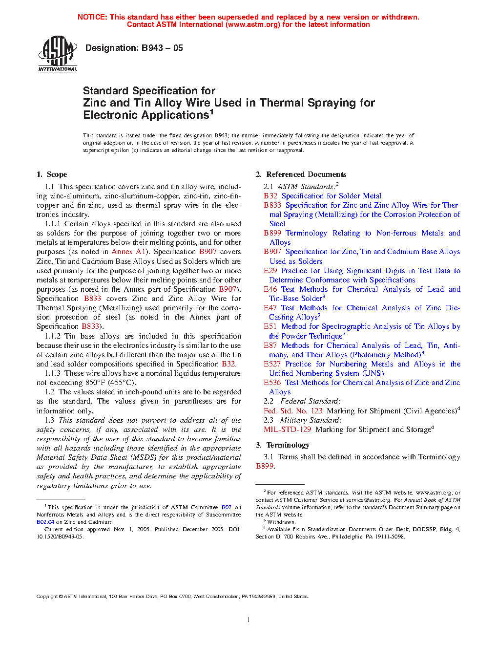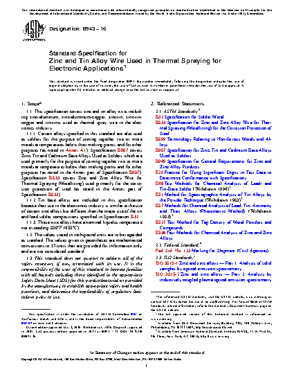 This specification covers zinc and tin alloy wire, including zinc-aluminum, zinc-aluminum-copper, zinc-tin, zinc-tin-copper an dtin-zinc, used as thermal spray wire in the electronics industry. The wire shall conform to the required chemical composition for cadmium, zinc, tin, lead, antimony, copper, aluminum, bismuth, arsenic, iron, nickel, and magnesium. The wire shall be clean and free of corrosion, adhering foreign material, scale, seams, nicks, burrs, and other defects which would interfere with the operation of thermal spraying equipment. The wire shall uncoil readily and be free of bends or kinks that would prevent its passage through the thermal spray gun. Sampling methodology should ensure that the sample slected for testing is representative of the matreial. The diameter of the wire shall be determines at the end and the beginning of each continuous wire.