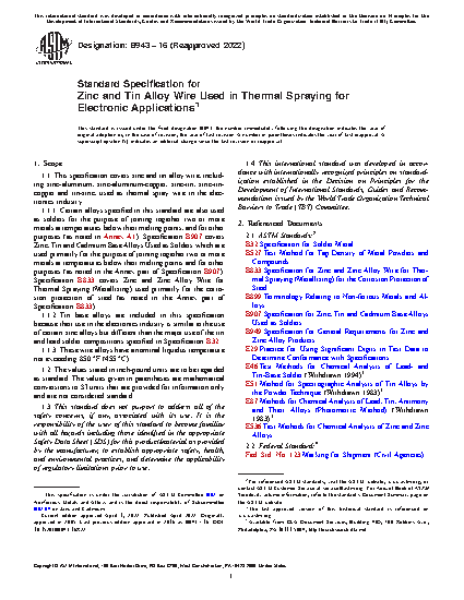 1.1 This specification covers zinc and tin alloy wire, including zinc-aluminum, zinc-aluminum-copper, zinc-tin, zinc-tin-copper and tin-zinc, used as thermal spray wire in the electronics industry.