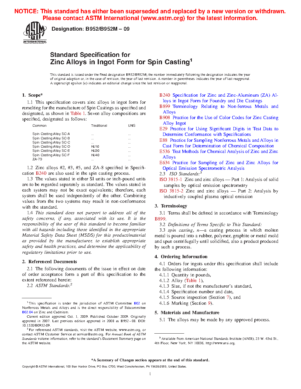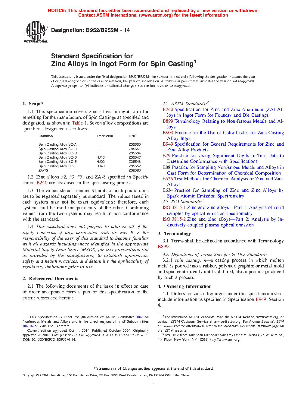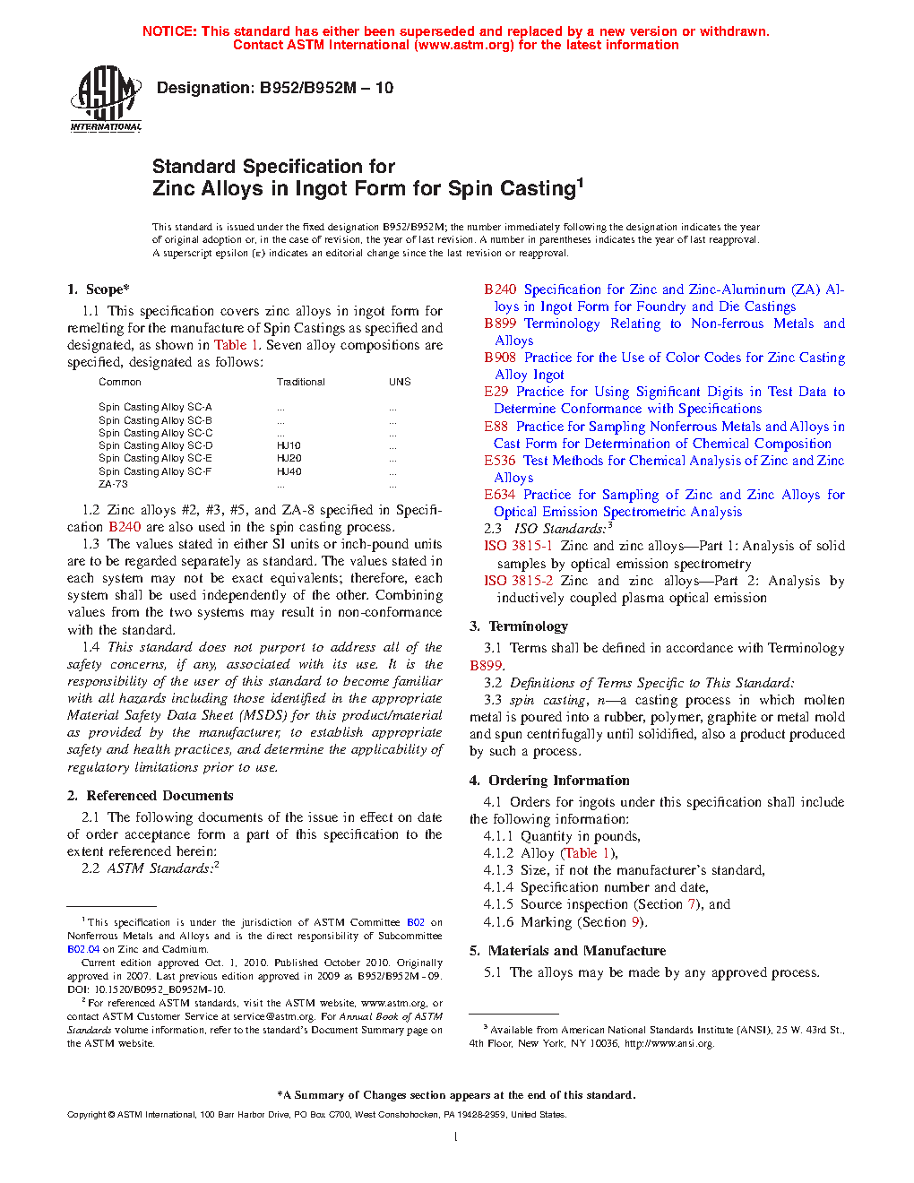 1.2 Zinc alloys #2, #3, #5, and ZA-8 specified in Specification B240 are also used in the spin casting process.