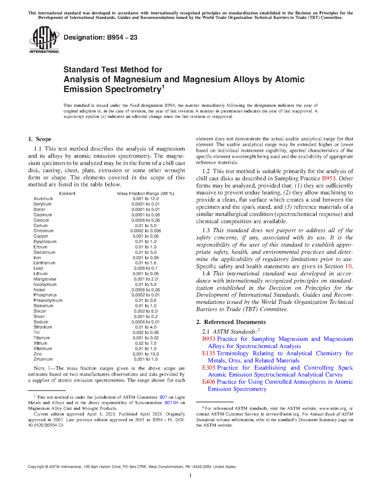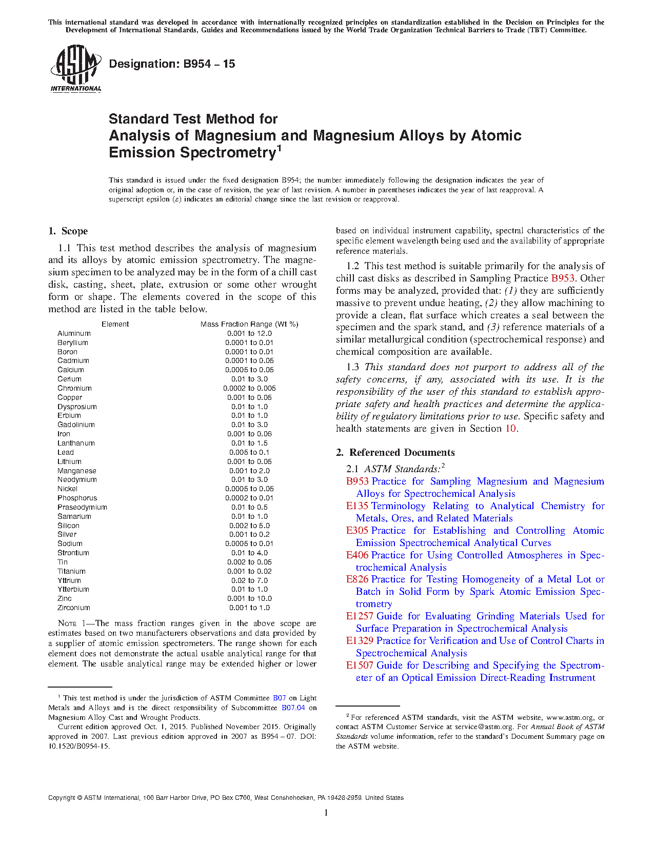 Note 1: The mass fraction ranges given in the above scope are estimates based on two manufacturers observations and data provided by a supplier of atomic emission spectrometers. The range shown for each element does not demonstrate the actual usable analytical range for that element. The usable analytical range may be extended higher or lower based on individual instrument capability, spectral characteristics of the specific element wavelength being used and the availability of appropriate reference materials.