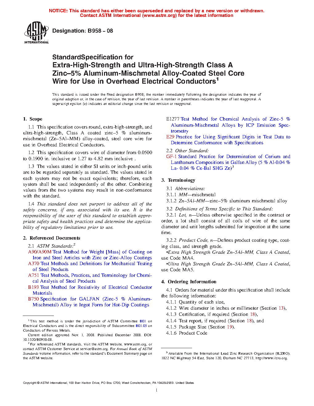 1.1 This specification covers round, extra-high-strength, and ultra-high-strength, Class A coated zinc–5 % aluminum-mischmetal (Zn–5Al–MM) alloy-coated, steel core wire for use in Overhead Electrical Conductors.
