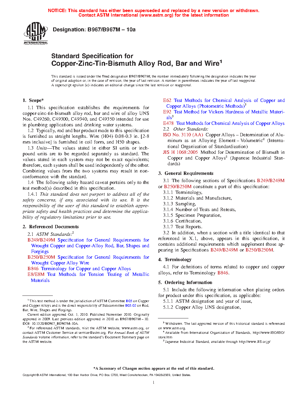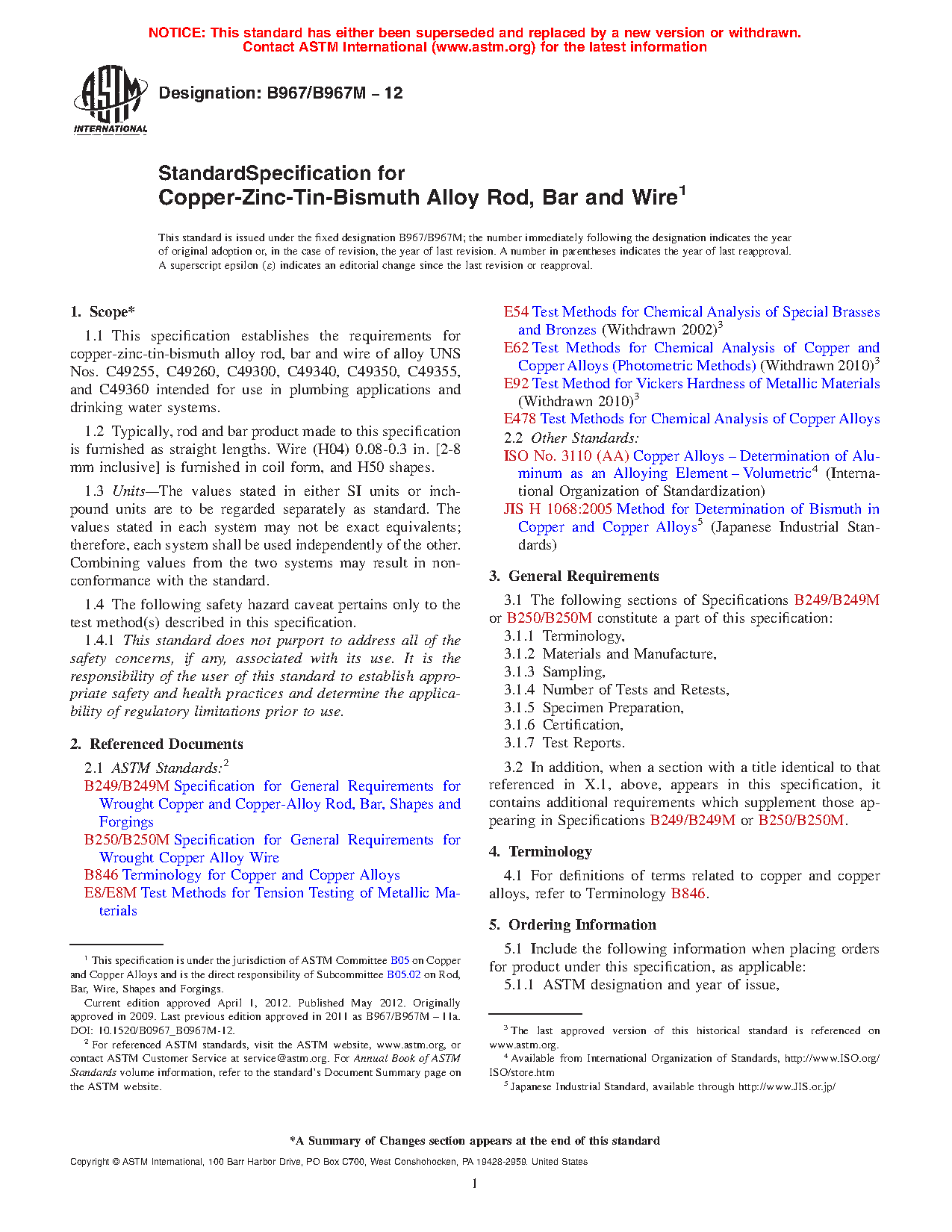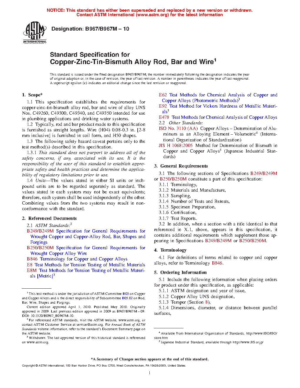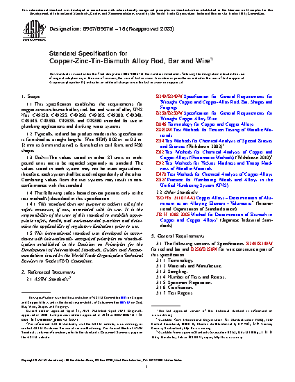 This specification covers the requirements for copper-zinc-tin-bismuth alloy rod, bar and wire intended for use in plumbing application and drinking water system. The product shall be manufactured by such hot working, cold working, and annealing processes as to produce a uniform wrought structure in the finished product. Chemical analysis, tensile strength, hardness, and yield strength test methods shall be performed in accordance to the specified requirements.