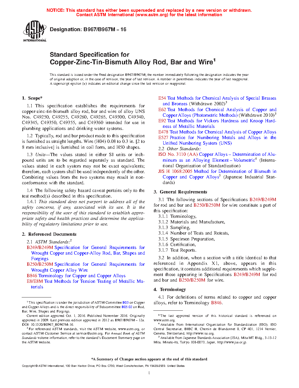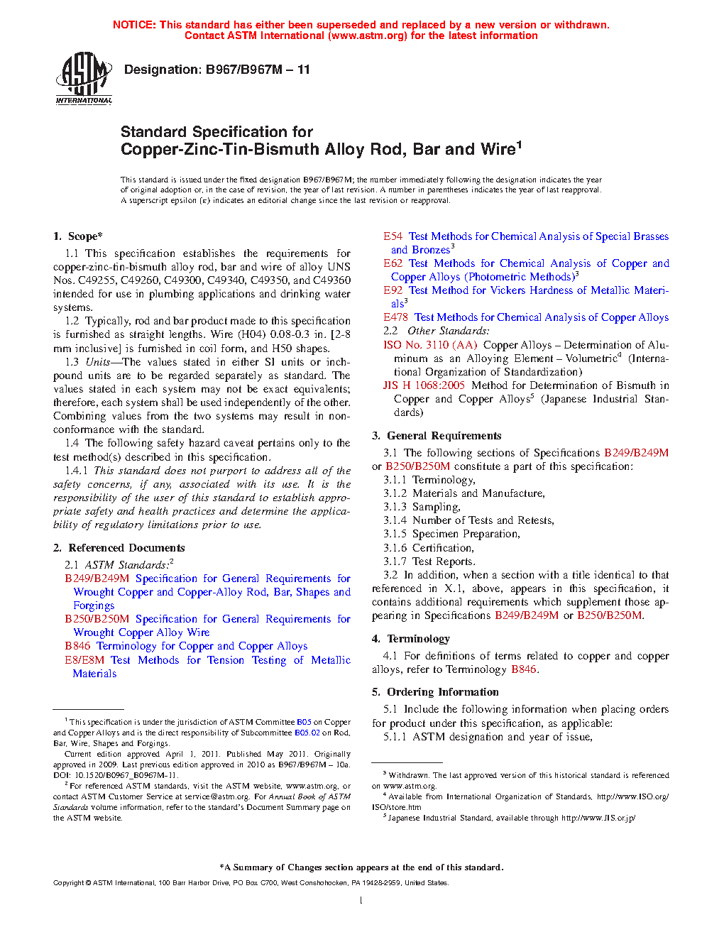 1.1 This specification establishes the requirements for copper-zinc-tin-bismuth alloy rod, bar and wire of alloy UNS Nos. C49250, C49255, C49260, C49265, C49300, C49340, C49345, C49350, C49355, and C49360 intended for use in plumbing applications and drinking water systems.