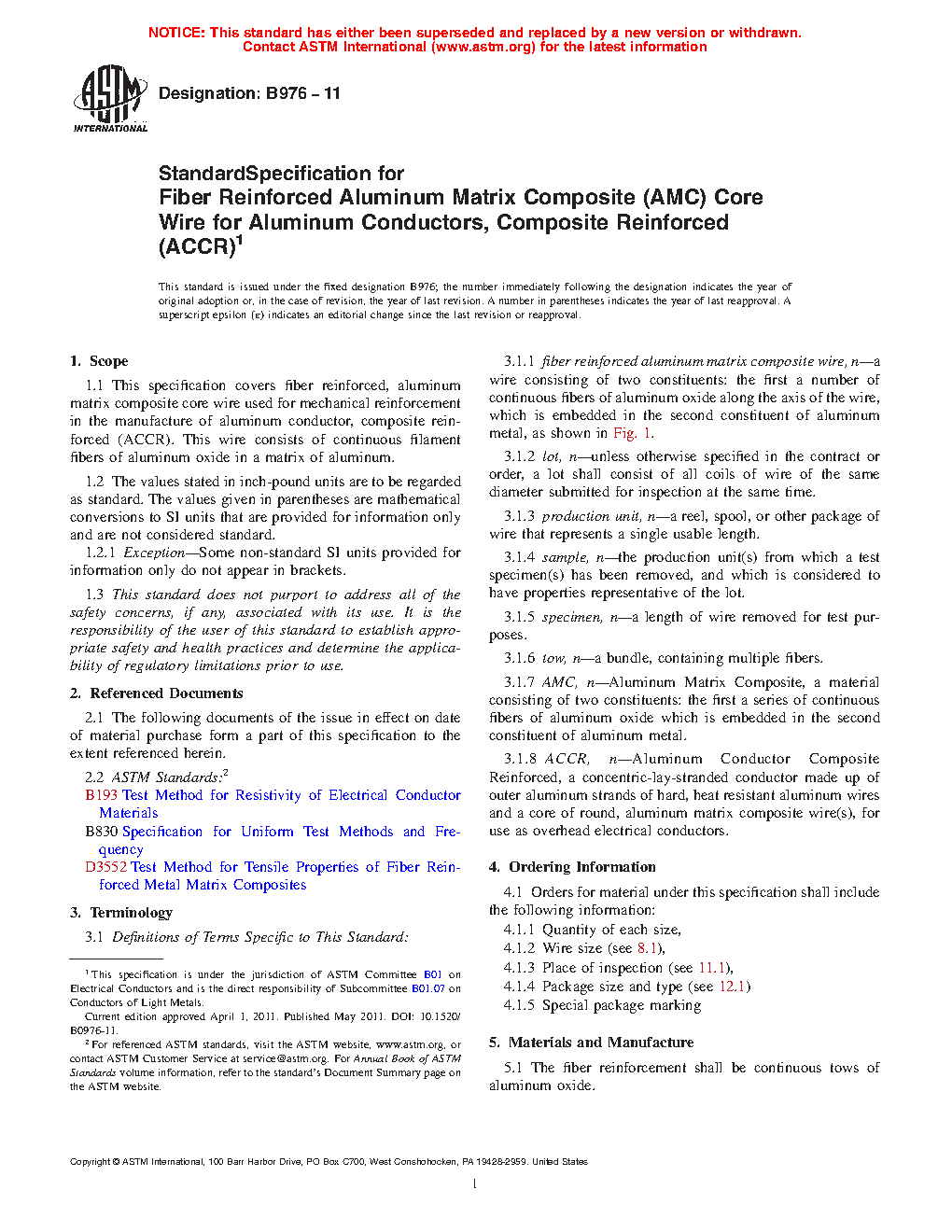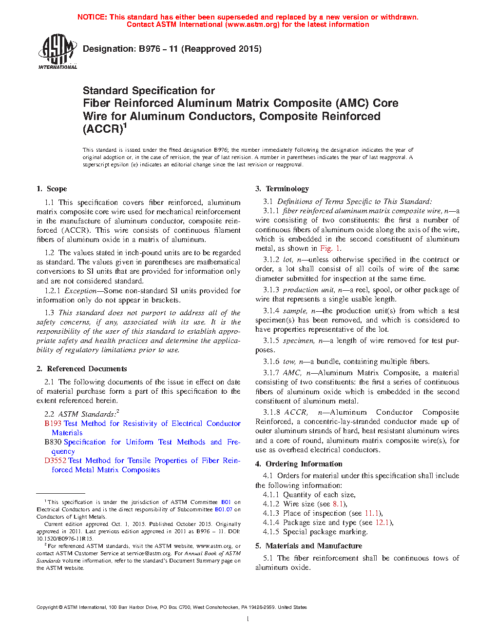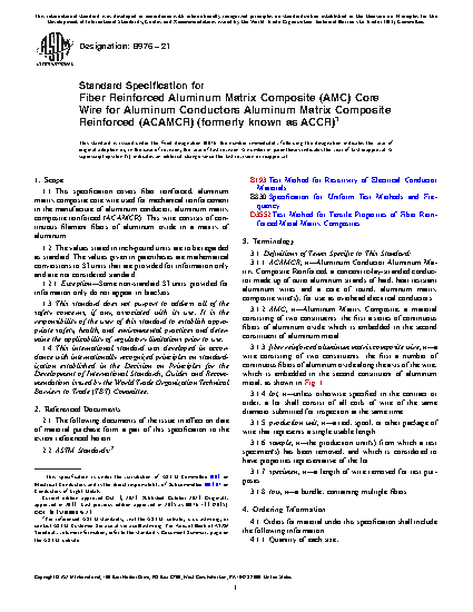 1.1 This specification covers fiber reinforced, aluminum matrix composite core wire used for mechanical reinforcement in the manufacture of aluminum conductor, composite reinforced (ACCR). This wire consists of continuous filament fibers of aluminum oxide in a matrix of aluminum.