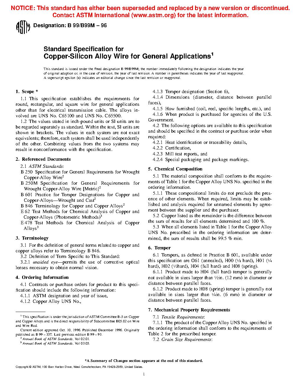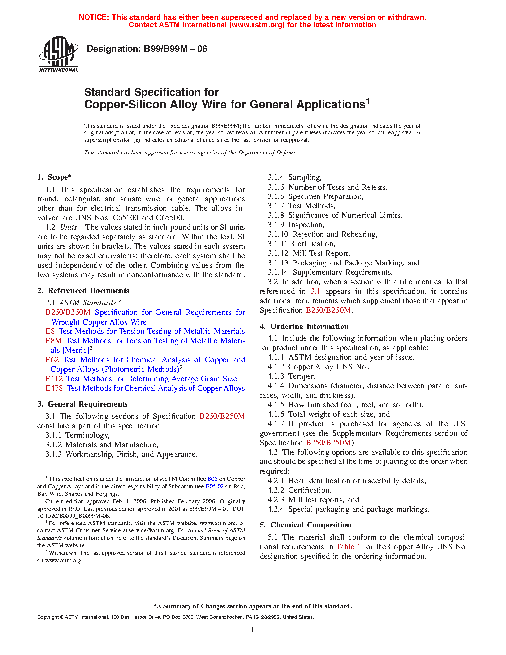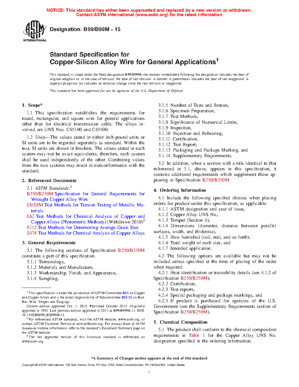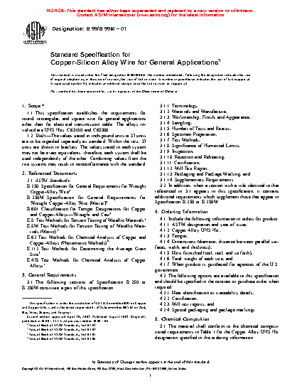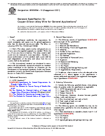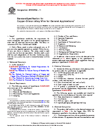 1.1 This specification establishes the requirements for round, rectangular, and square wire for general applications other than for electrical transmission cable. The alloys involved are UNS Nos. C65100 and C65500.