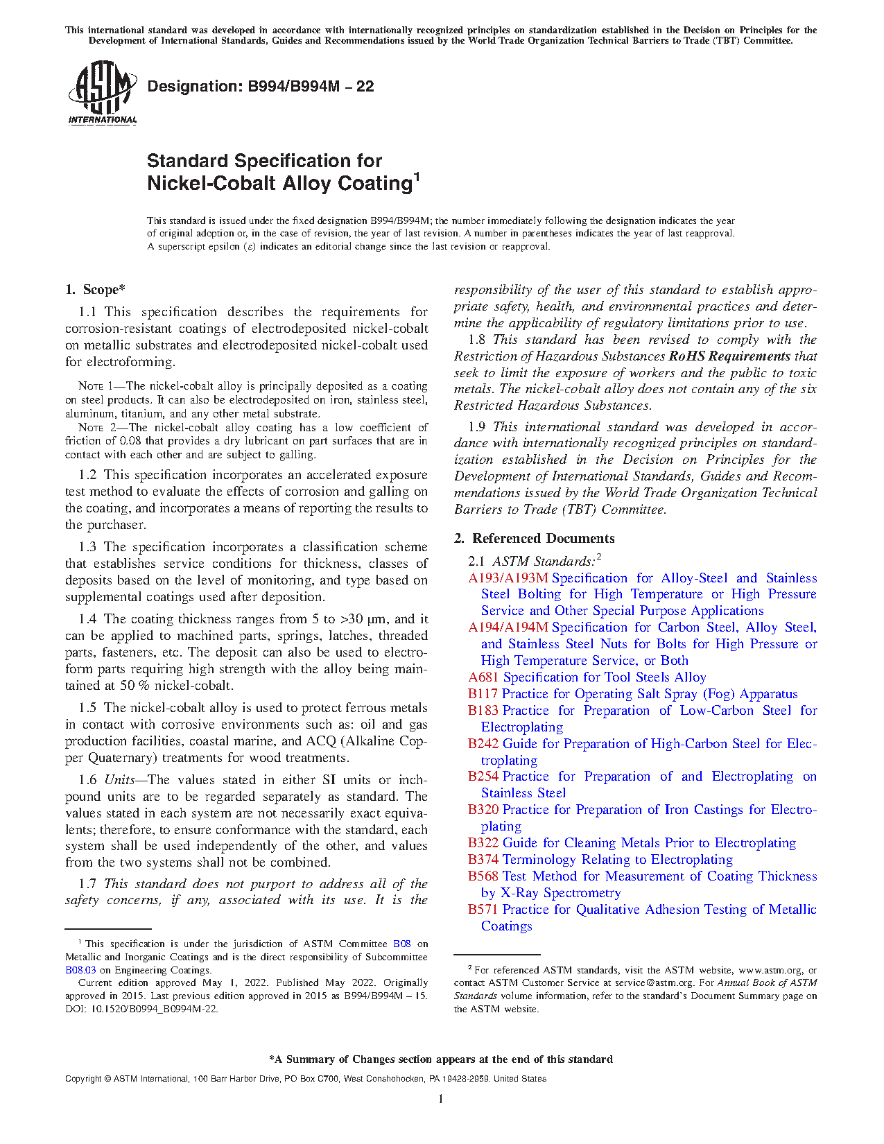 This specification outlines the requirements for corrosion-resistant coatings of electrodeposited nickel-cobalt on metallic substrates and electrodeposited nickel-cobalt used for electroforming. It includes an accelerated exposure test method to evaluate the effects of corrosion and galling on the nickel-cobalt alloy coating, as well as a means of reporting the results to the purchaser.