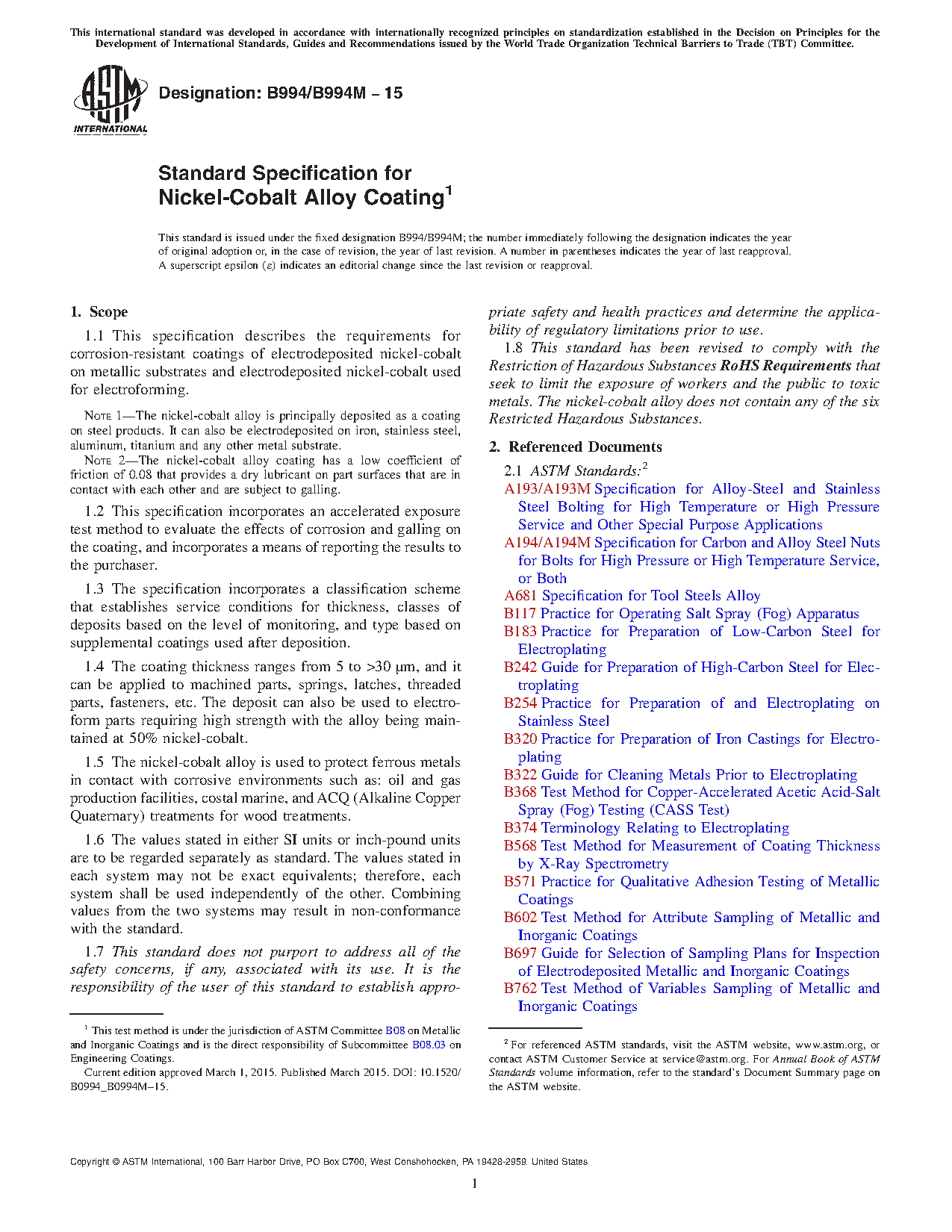 1.4 The coating thickness ranges from 5 to >30 μm, and it can be applied to machined parts, springs, latches, threaded parts, fasteners, etc. The deposit can also be used to electroform parts requiring high strength with the alloy being maintained at 50% nickel-cobalt.
