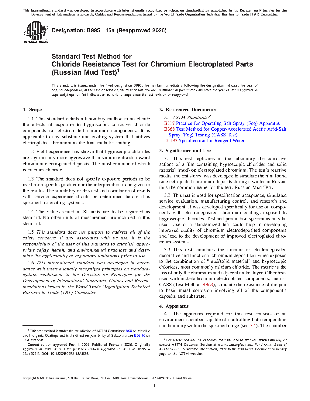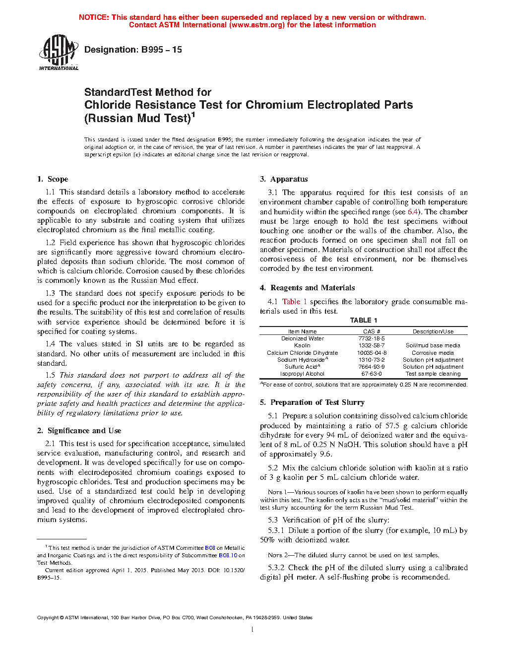 1.2 Field experience has shown that hygroscopic chlorides are significantly more aggressive toward chromium electroplated deposits than sodium chloride. The most common of which is calcium chloride. Corrosion caused by these chlorides is commonly known as the Russian Mud effect.