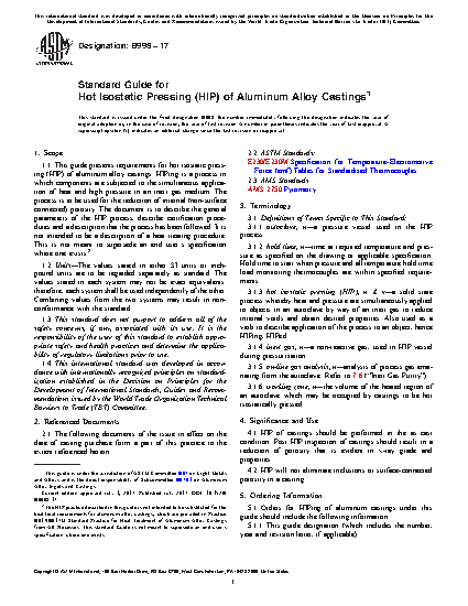 1.1 This guide covers requirements for hot isostatic pressing (HIP) of aluminum alloy castings. HIPing is a process in which components are subjected to the simultaneous application of heat and high pressure in an inert gas medium. The process is to be used for the reduction of internal (non-surface connected) porosity. The document is to describe the general parameters of the HIP process, describe certification procedures and a description that the process has been followed. It is not intended to be a description of a heat treating procedure. This is not meant to supersede an end user’s specification where one exists.2