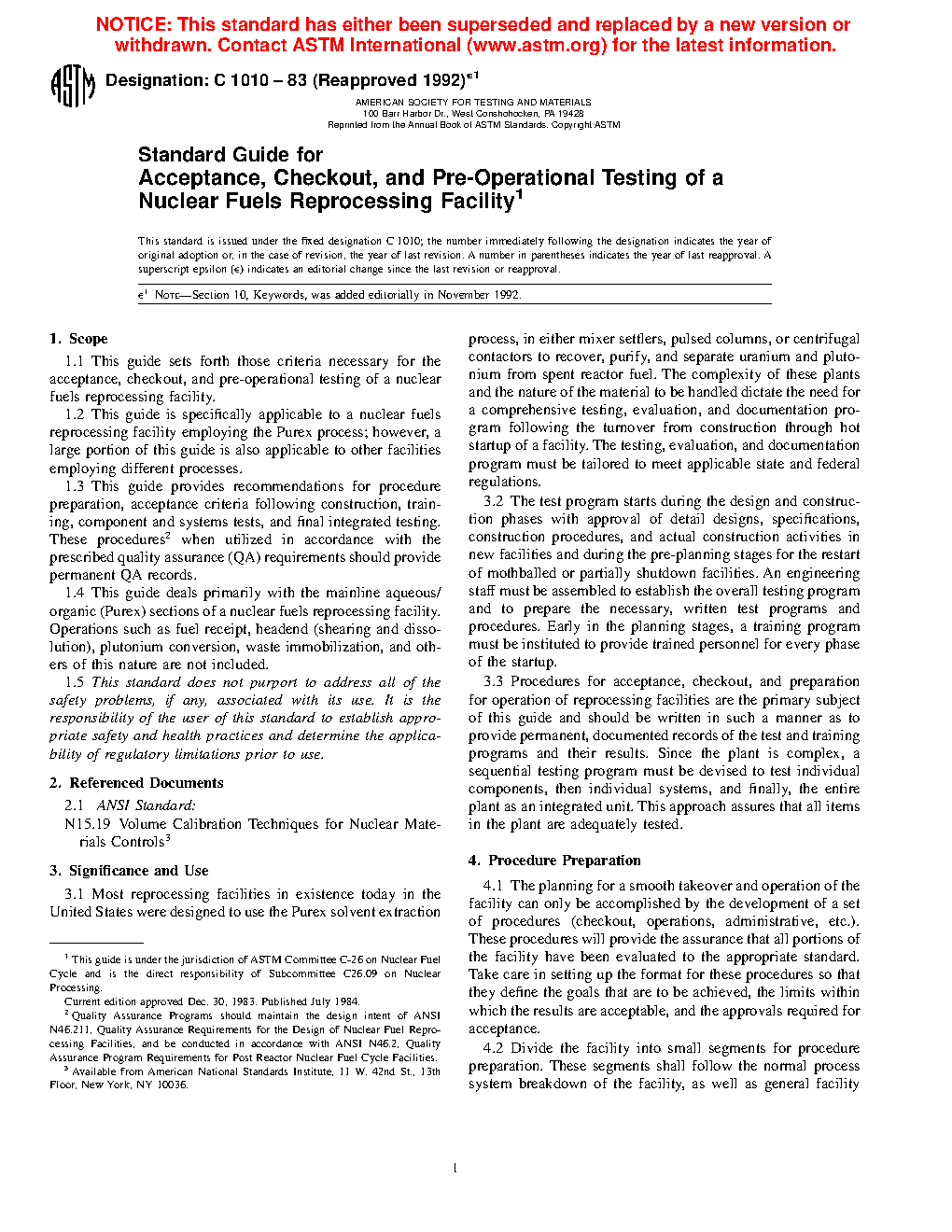 1.1 This guide sets forth those criteria necessary for the acceptance, checkout, and pre-operational testing of a nuclear fuels reprocessing facility.