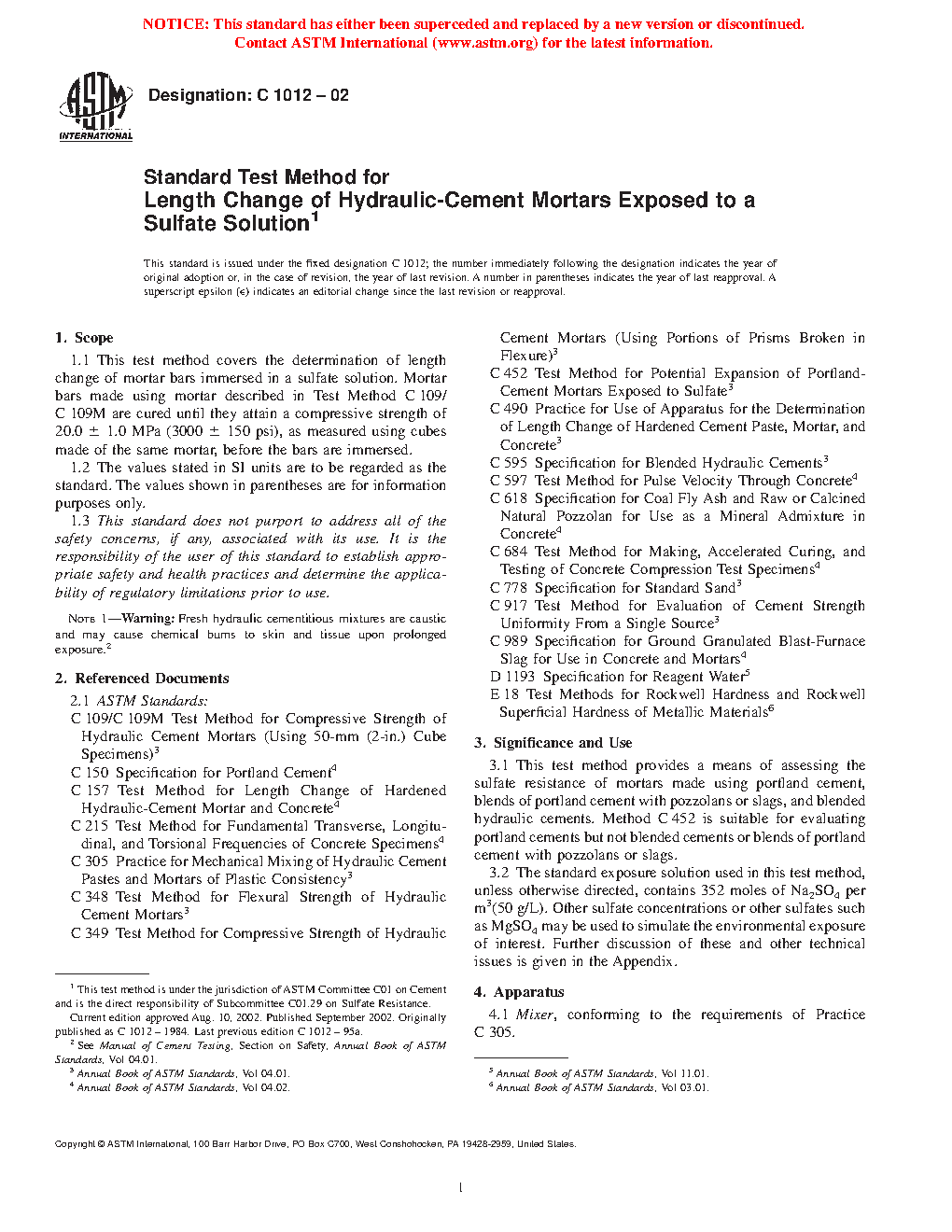 1.1 This test method covers the determination of length change of mortar bars immersed in a sulfate solution. Mortar bars made using mortar described in Test Method C109/ C109M are cured until they attain a compressive strength of 20.0 + 1.0 MPa (3000 + 150 psi), as measured using cubes made of the same mortar, before the bars are immersed.