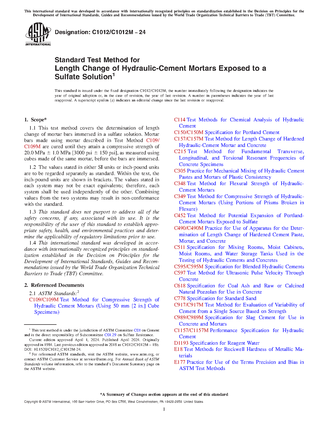 1.1 This test method covers the determination of length change of mortar bars immersed in a sulfate solution. Mortar bars made using mortar described in Test Method C109/C109M are cured until they attain a compressive strength of 20.0 ± 1.0 MPa [3000 ± 150 psi], as measured using cubes made of the same mortar, before the bars are immersed.