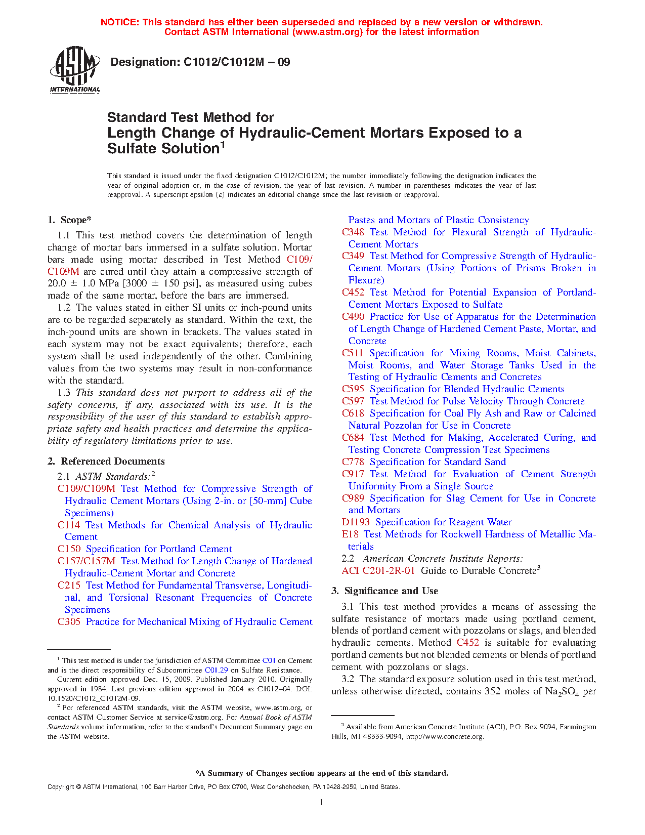 3.1 This test method provides a means of assessing the sulfate resistance of mortars made using portland cement, blends of portland cement with pozzolans or slags, and blended hydraulic cements. Test Method C452 is suitable for evaluating portland cements but not blended cements or blends of portland cement with pozzolans or slags.