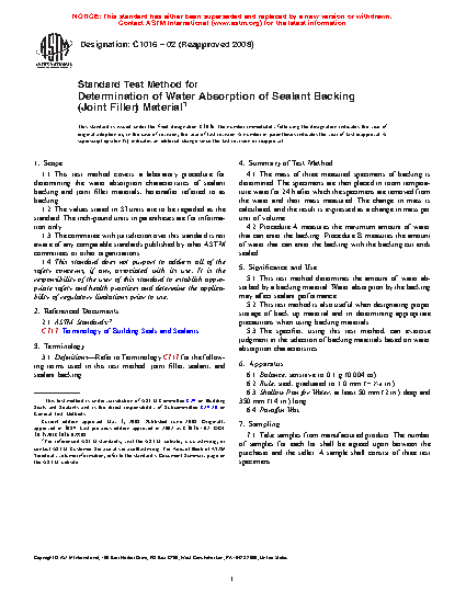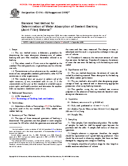 1.1 This test method covers a laboratory procedure for determining the water absorption characteristics of sealant backing and joint filler materials, hereinafter referred to as backing.