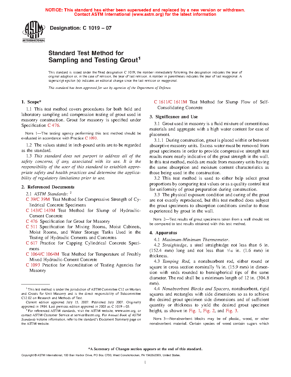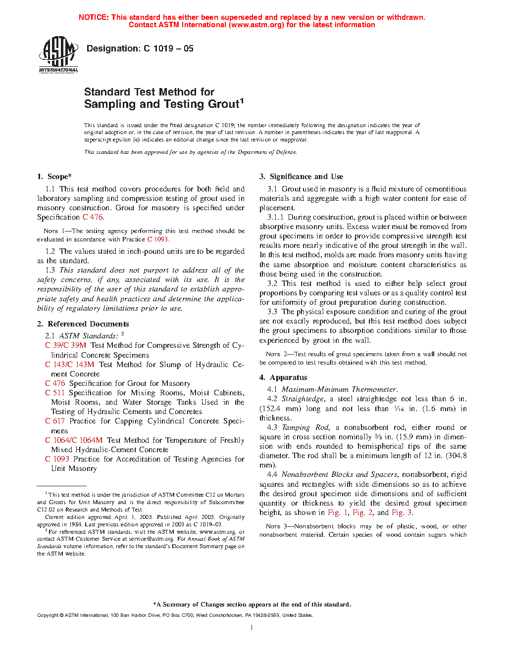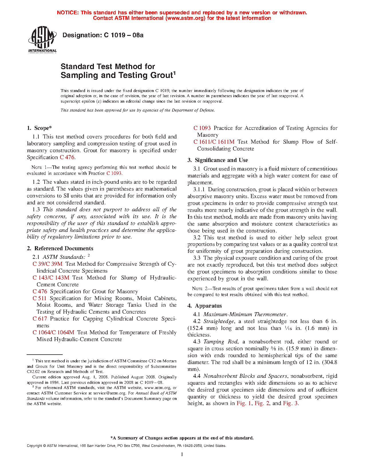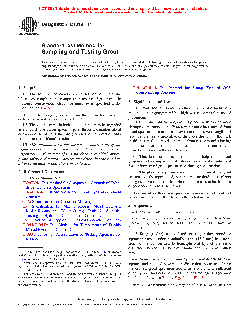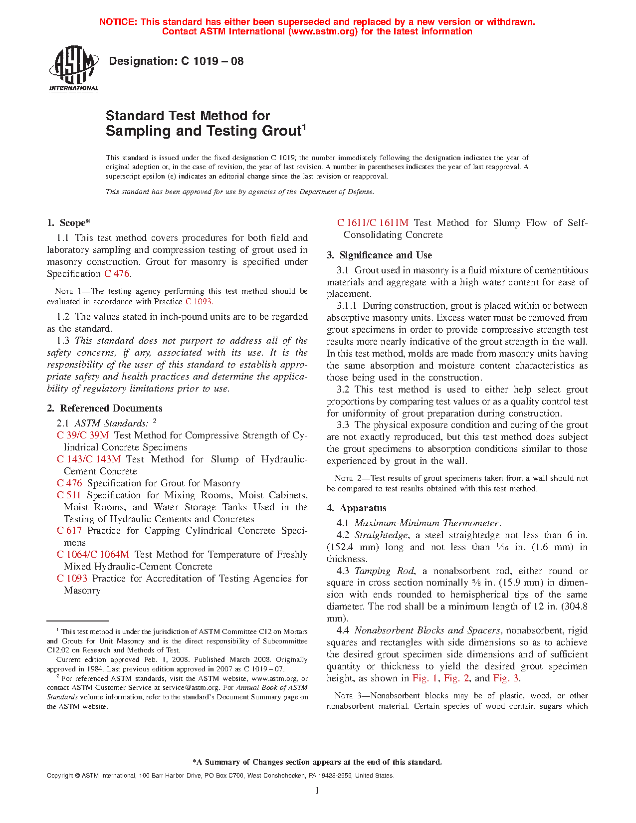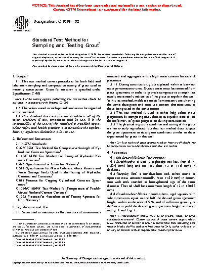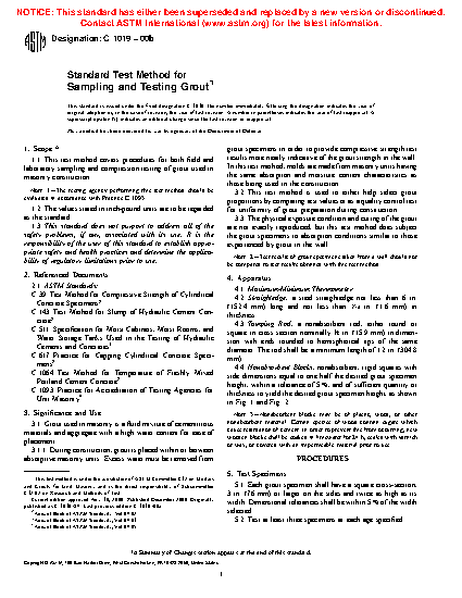 1.1 This test method covers procedures for both field and laboratory sampling and compression testing of grout used in masonry construction. Grout for masonry is specified under Specification C476.
