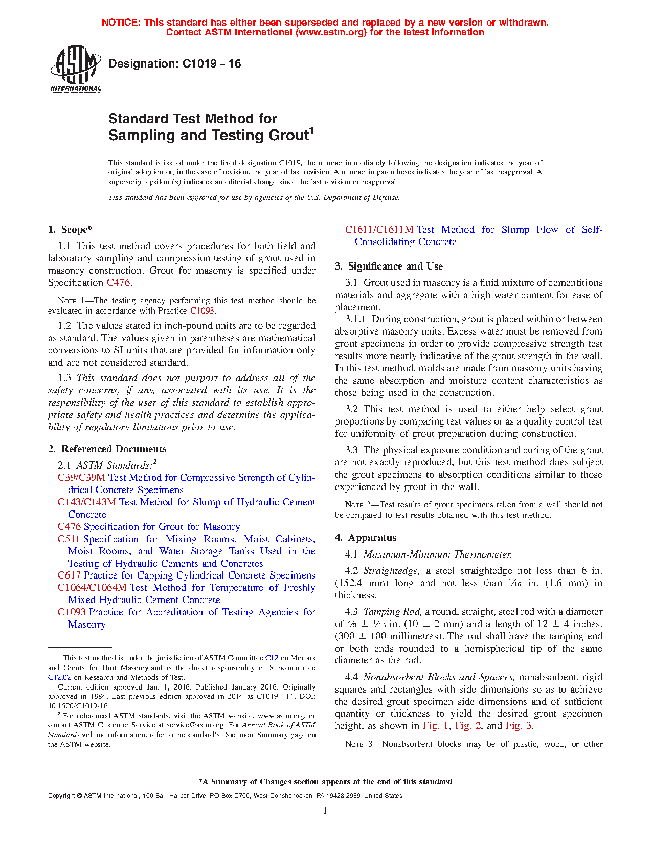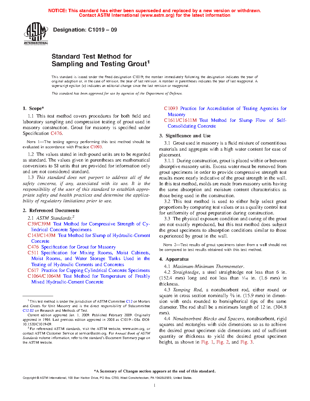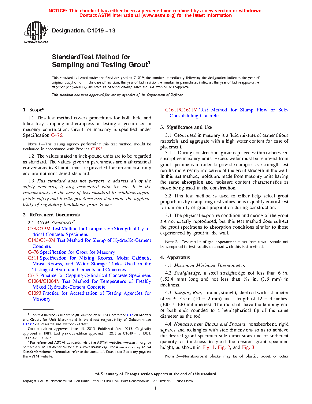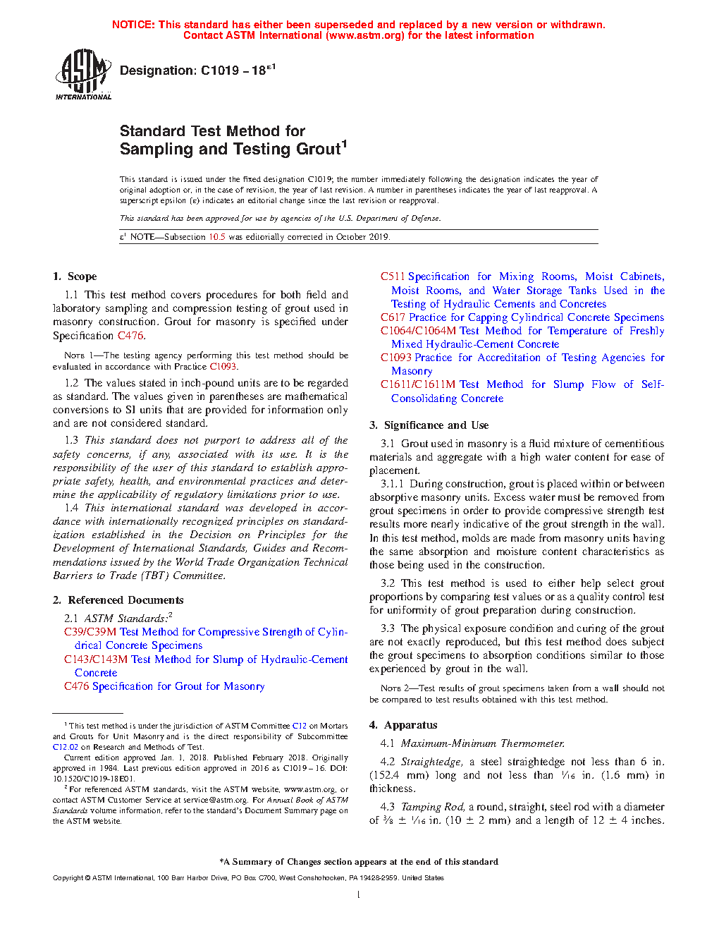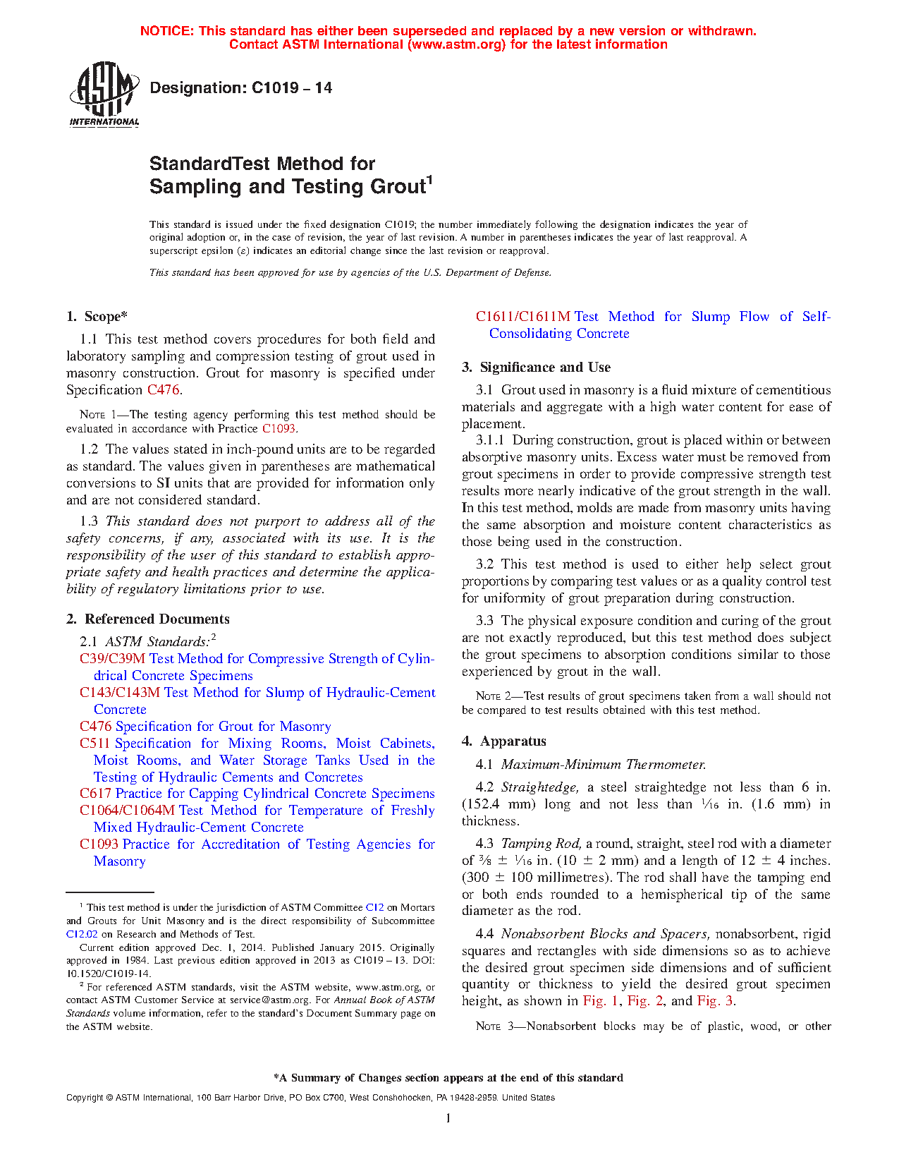 1.1 This test method covers procedures for both field and laboratory sampling and compression testing of grout used in masonry construction. Grout for masonry is specified under Specification C476.