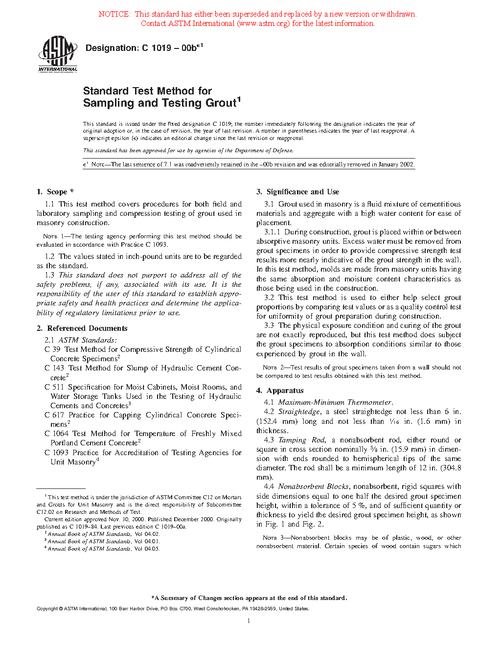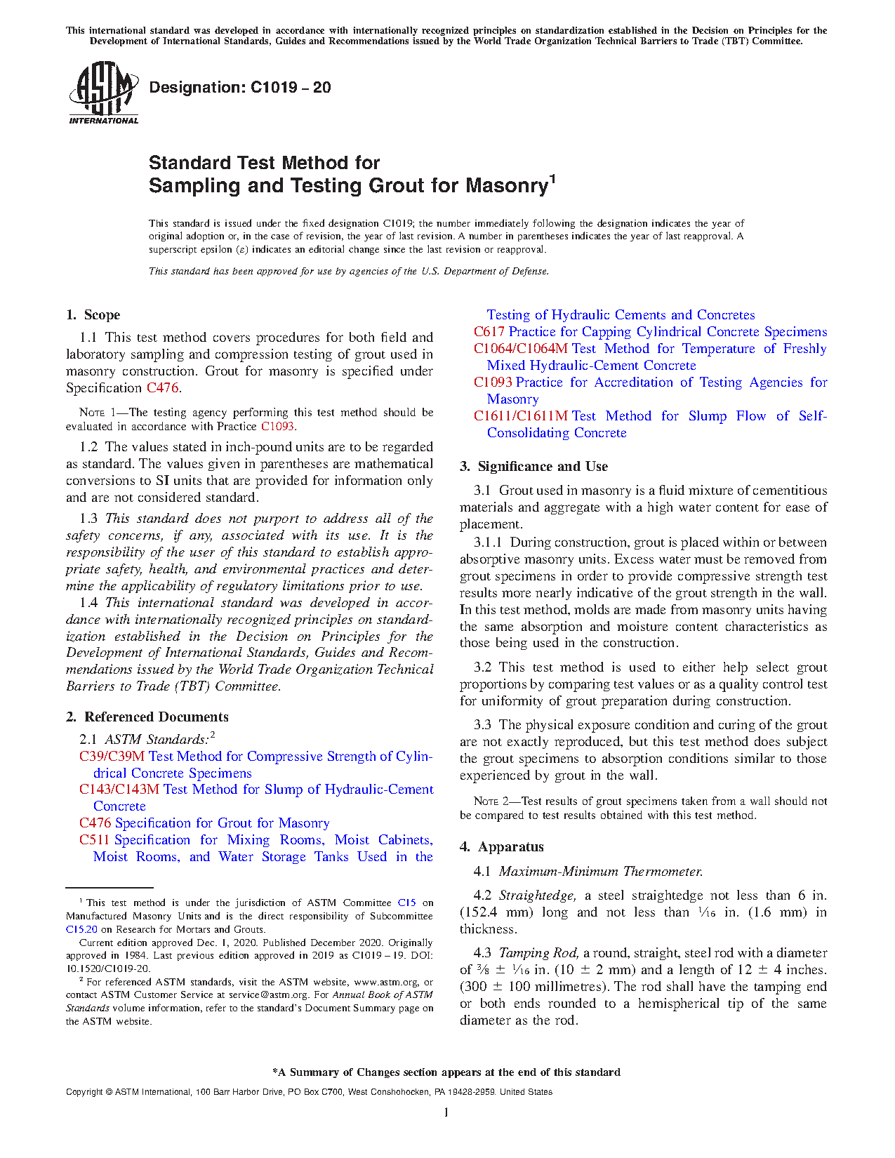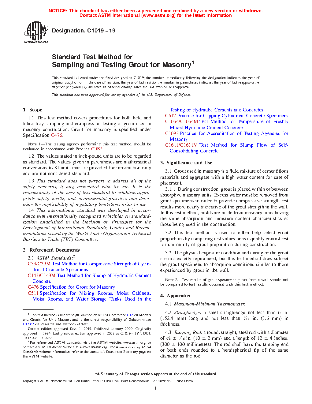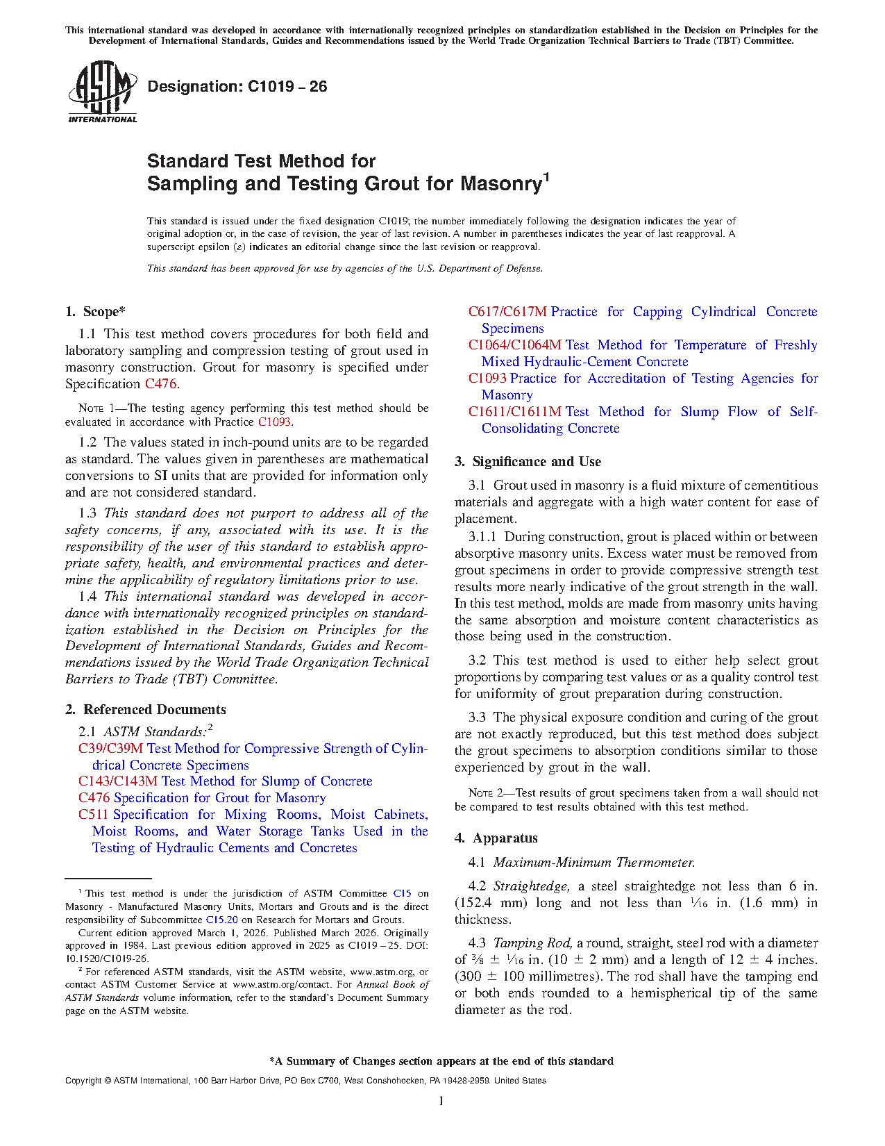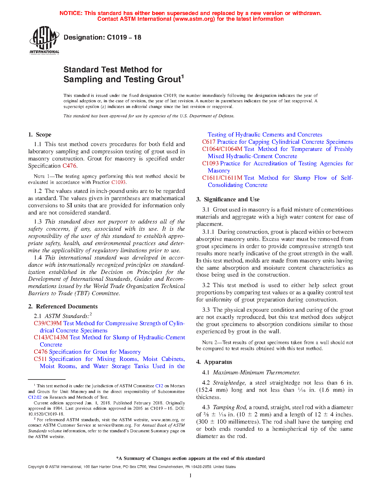 1.1 This test method covers procedures for both field and laboratory sampling and compression testing of grout used in masonry construction. Grout for masonry is specified under Specification C476.