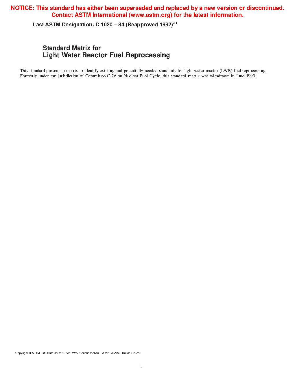 1.1 This standard presents a matrix to identify existing and potentially needed standards for light water reactor (LWR) fuel reprocessing.