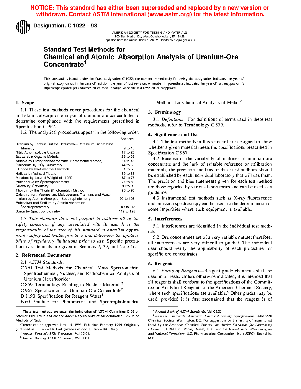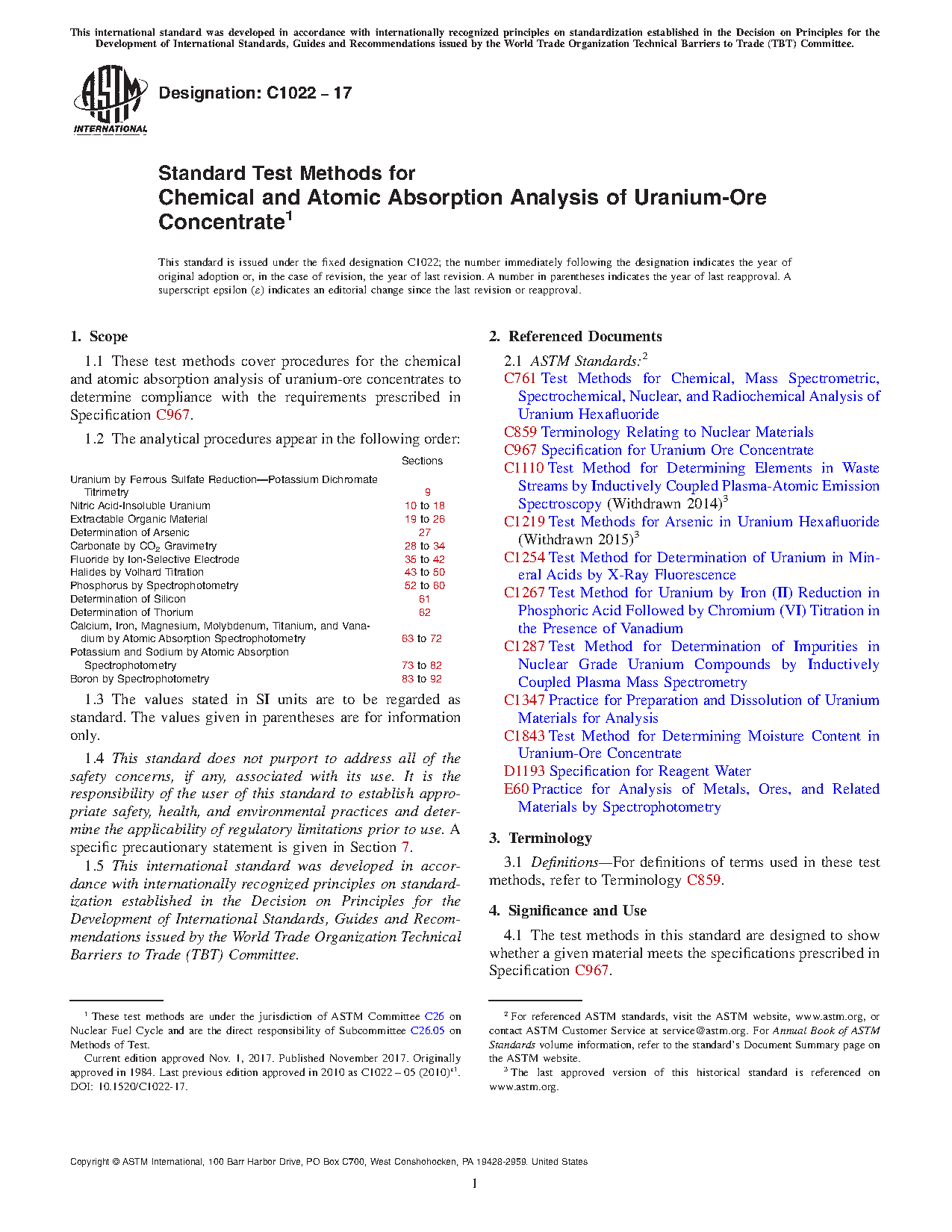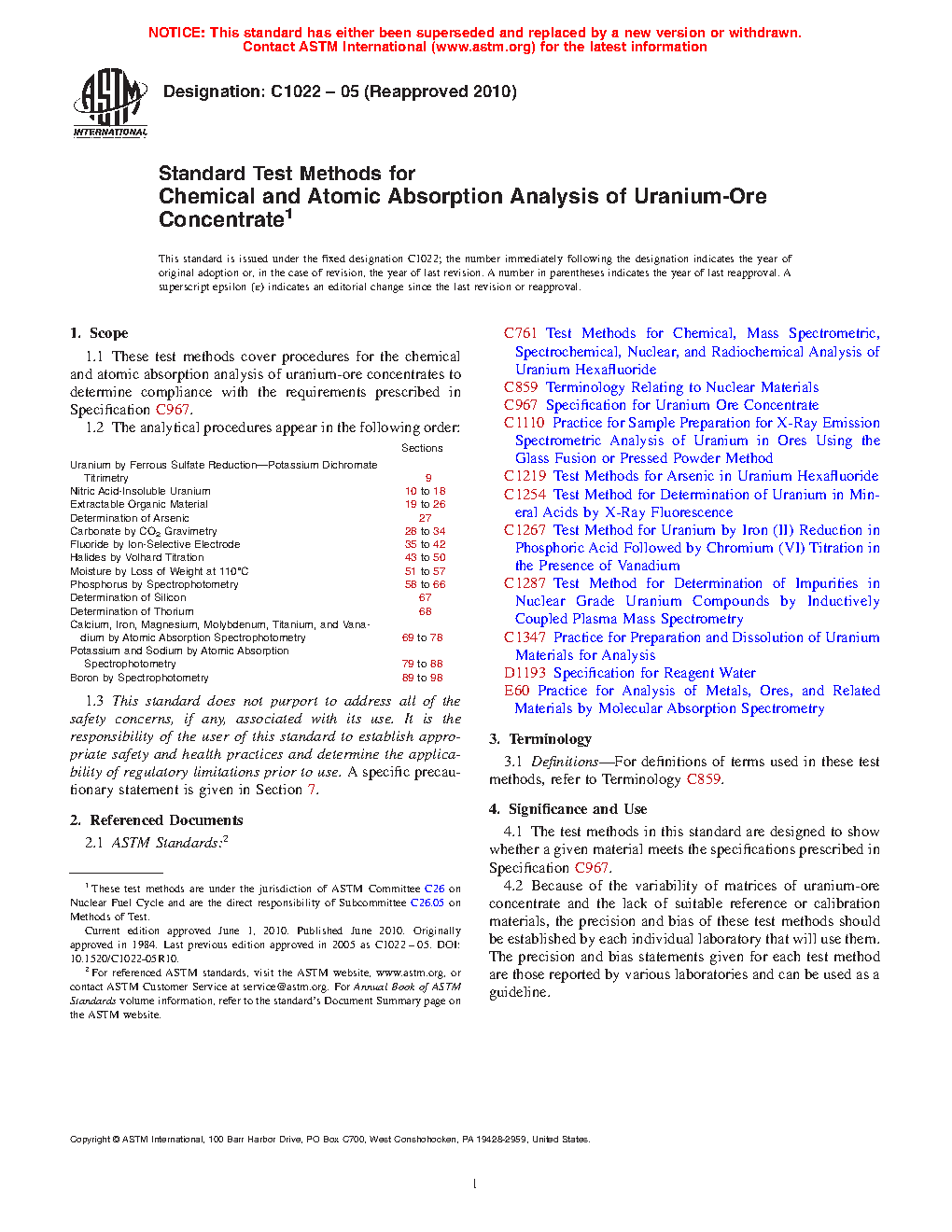 1.1 These test methods cover procedures for the chemical and atomic absorption analysis of uranium-ore concentrates to determine compliance with the requirements prescribed in Specification C967.