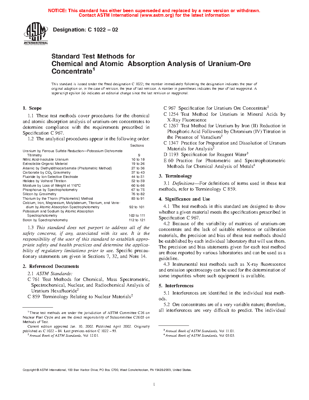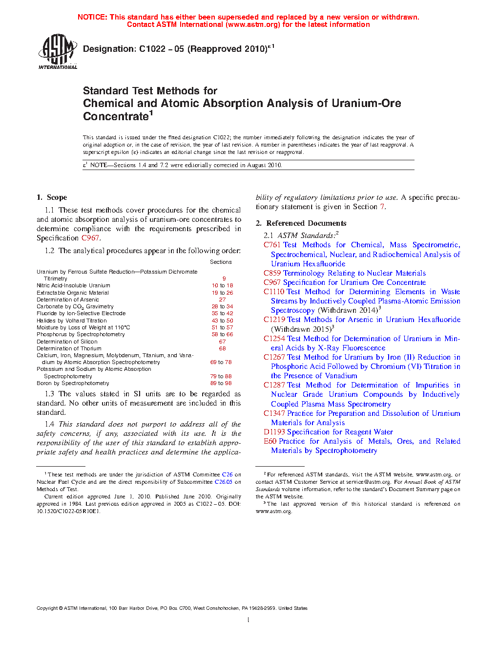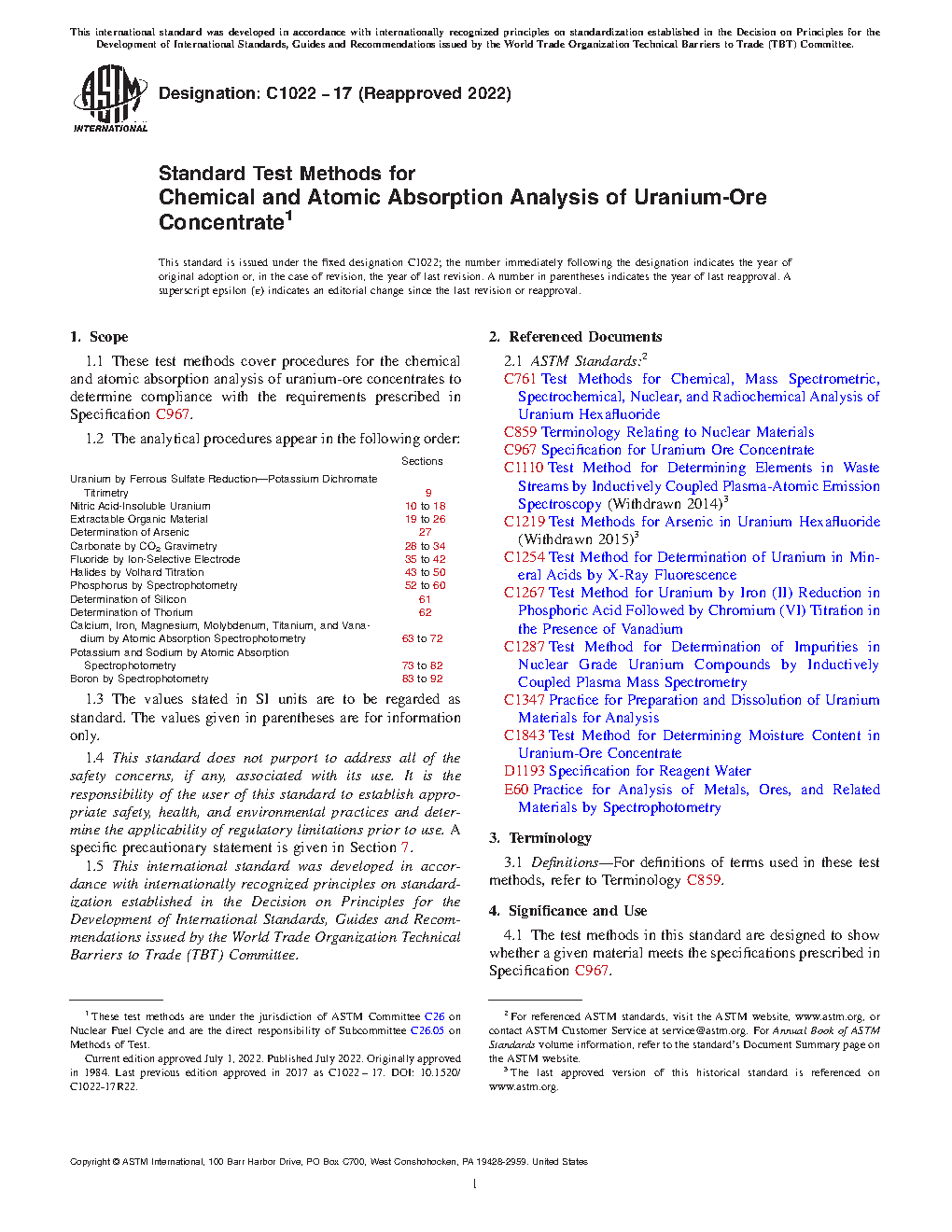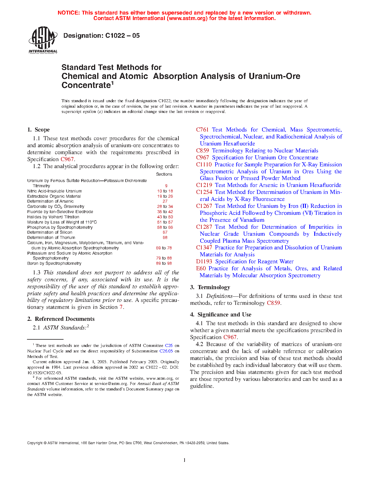 1.1 These test methods cover procedures for the chemical and atomic absorption analysis of uranium-ore concentrates to determine compliance with the requirements prescribed in Specification C967.