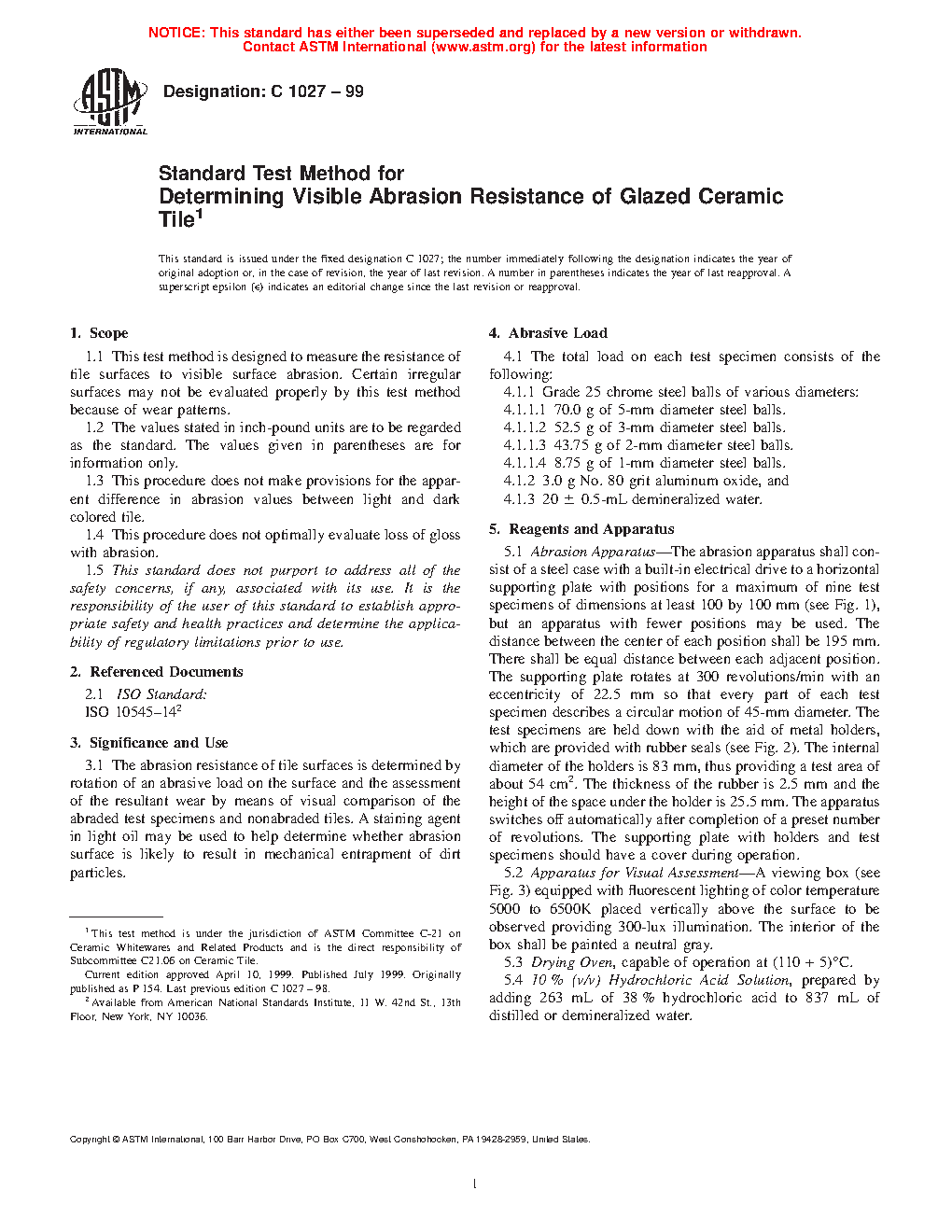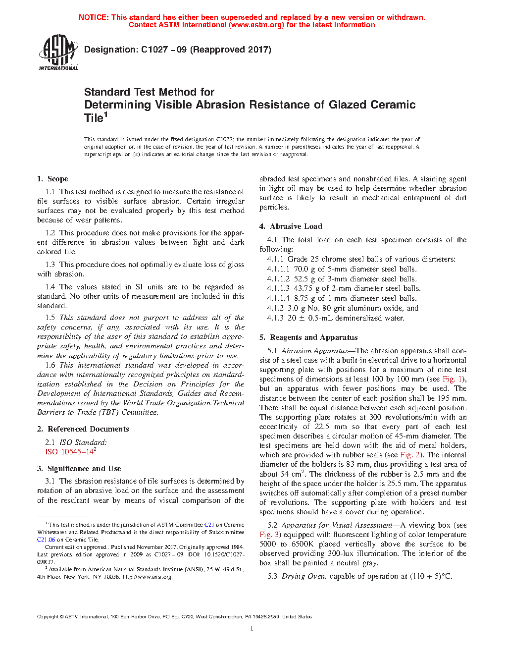 3.1 The abrasion resistance of tile surfaces is determined by rotation of an abrasive load on the surface and the assessment of the resultant wear by means of visual comparison of the abraded test specimens and nonabraded tiles. A staining agent in light oil may be used to help determine whether abrasion surface is likely to result in mechanical entrapment of dirt particles.